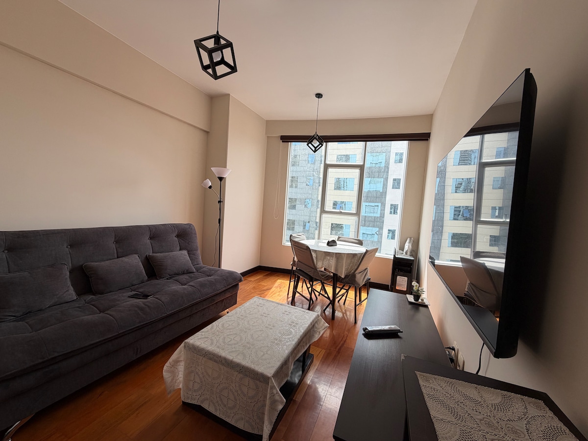 Enjoy a comfortable stay in this modern apartment with spectacular views—ideal for relaxing or working with ease. Includes pool, dry sauna, steam room, and gym. Every detail is designed to offer a warm, practical, and pleasant experience. Located in a quiet, safe, and strategic area near cafés, embassies, banks, supermarkets, restaurants, and public transport. Perfect for couples, travelers, or work stays.
