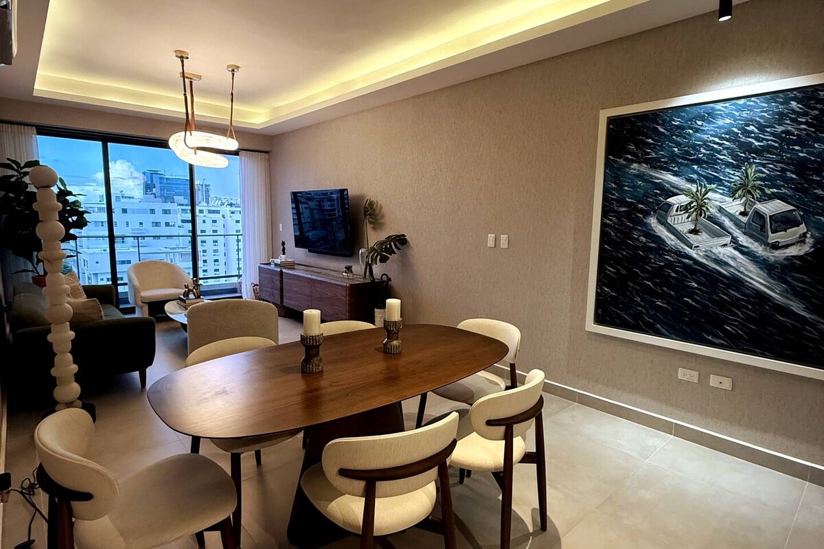 Disfruta de una experiencia de lujo en este céntrico alojamiento en uno de los barrios más seguros y acogedor de Santo Domingo, con mucho que ofrecer en las proximidades, bares, restaurantes,malls, supermercados, farmacias, a solo unos metros. Apartamento full equipado, en un edificio moderno, en un nivel 10, donde podrás disfrutar de unas vistas espectaculares. Impresionante área común, en el piso 12, piscina infinity, gym, cine, área de niños, barbecue Seguridad 24/7 y plaza propia de garaje