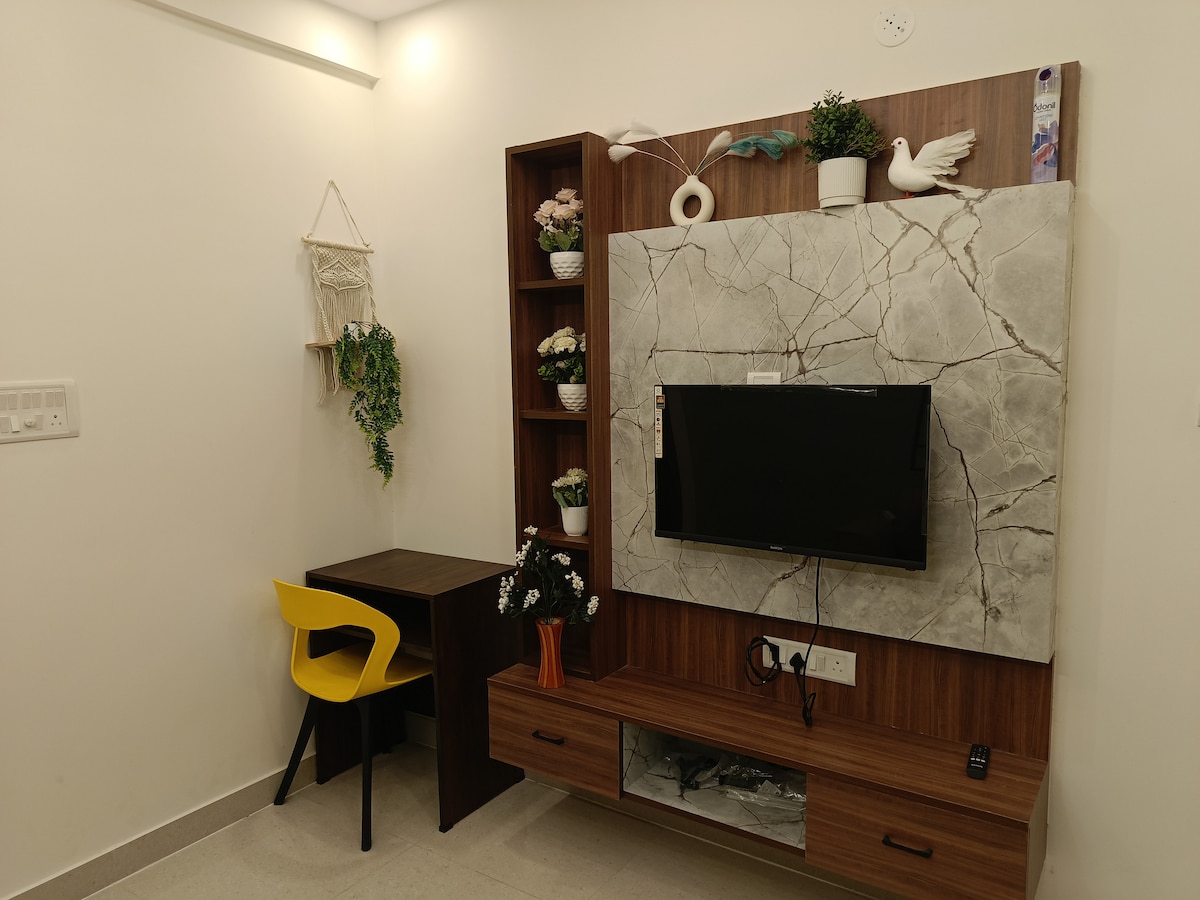 Note: Due to local regulations, currently hosting Indian guests only Nestled on a serene lane between 27 & 24th Main, steps away from restaurants, hypermarkets, hospitals, and lush parks 1BHK in GF with queen bed, crisp white bed and bath linens, divan, study table, dining table, dressing mirror, wardrobe, 43" Smart TV, Wi-Fi, fridge, induction stove, kettle, cookware, cooking ingredients, dinner set, RO water, cloth washer, drying stand, geyser, toiletries, hair dryer, iron table & inverter .