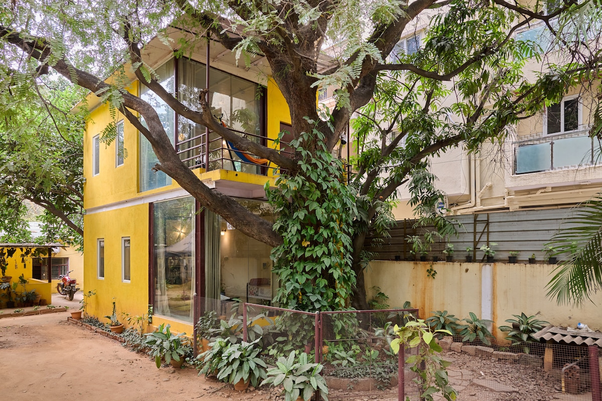 Hidden between LalBagh Botanical Gardens & Forum Mall, ten minutes from the city centre. Please note this is a space with a lot of trees and greenery. It comes with its share of insects, especially spiders/ants, and has a lot of birds, squirrels etc. Only book this space if comfortable with such harmless creatures. The cottage is rustic and basic. Quite a few restaurants & HSBC + SBI ATM's a few roads away. The new interstate bus terminal is close & takes 45min to the airport from there.