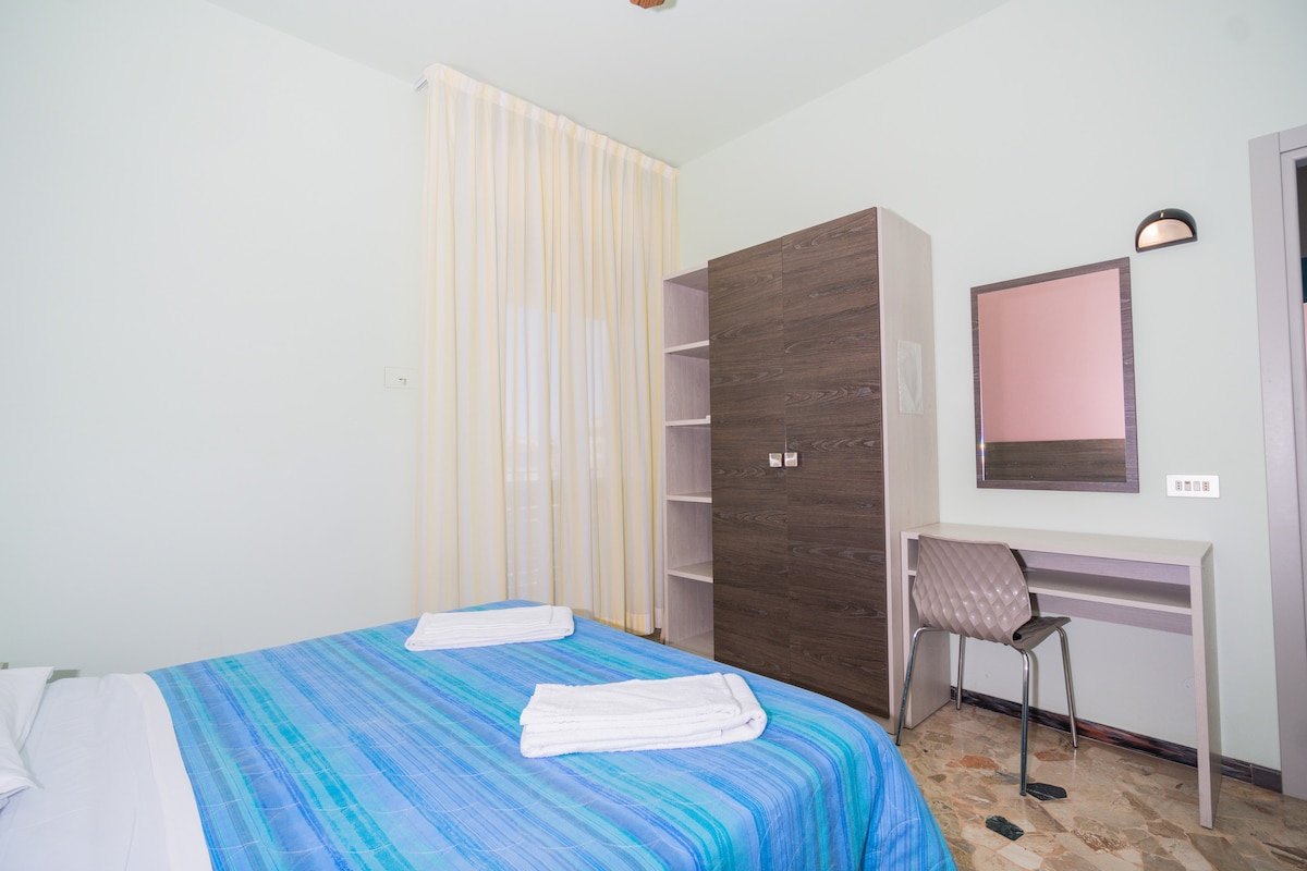 Quadruple room with balcony (double bed + bunk bed), private bathroom. Central air conditioning, safe, TV, hairdryer, and Wi-Fi. Comfortable double bed and bunk bed. Parking next to the hotel costs €8.00 per night. You can stay with your four-legged friend for an additional €10.00 per night. The tourist tax is €1.50 per night per person (children excluded).