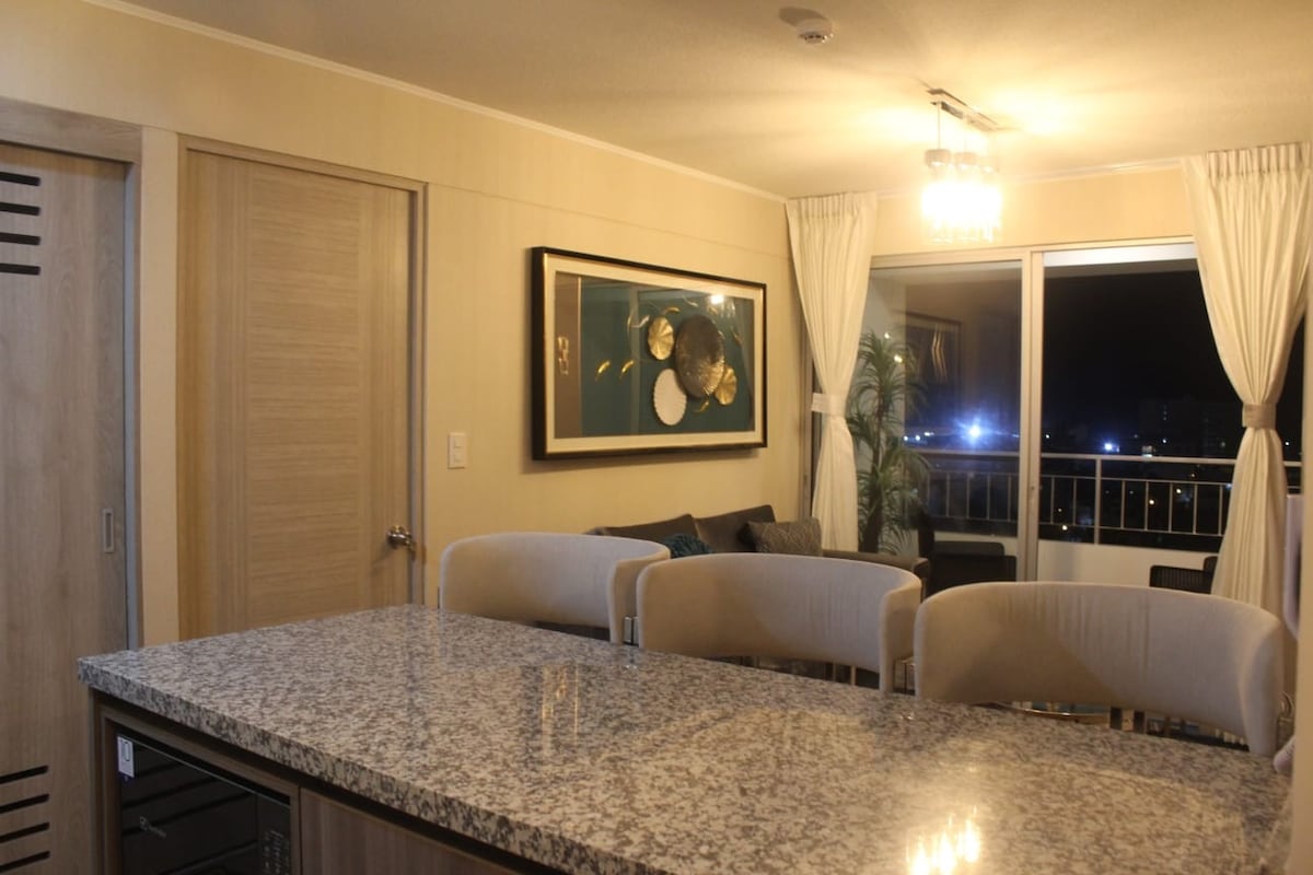 Nuestro apartamento es de los muy pocos en la zona que tiene una preciosa vista directa y panoramica al océano Pacífico, disfruta la paz del sonido del mar e impresionantes atardeceres, es acogedor, bien iluminado y decorado, la cocina esta equipada con todo lo necesario, para una perfecta estadia, el apartamento cuenta con potente WiFi y 02 Smart TV por cable. El edificio tiene áreas comunes; 02 piscinas: (adultos y niños), parrillas, bar lounge, sala de reuniones, gimnasio y área de trote.