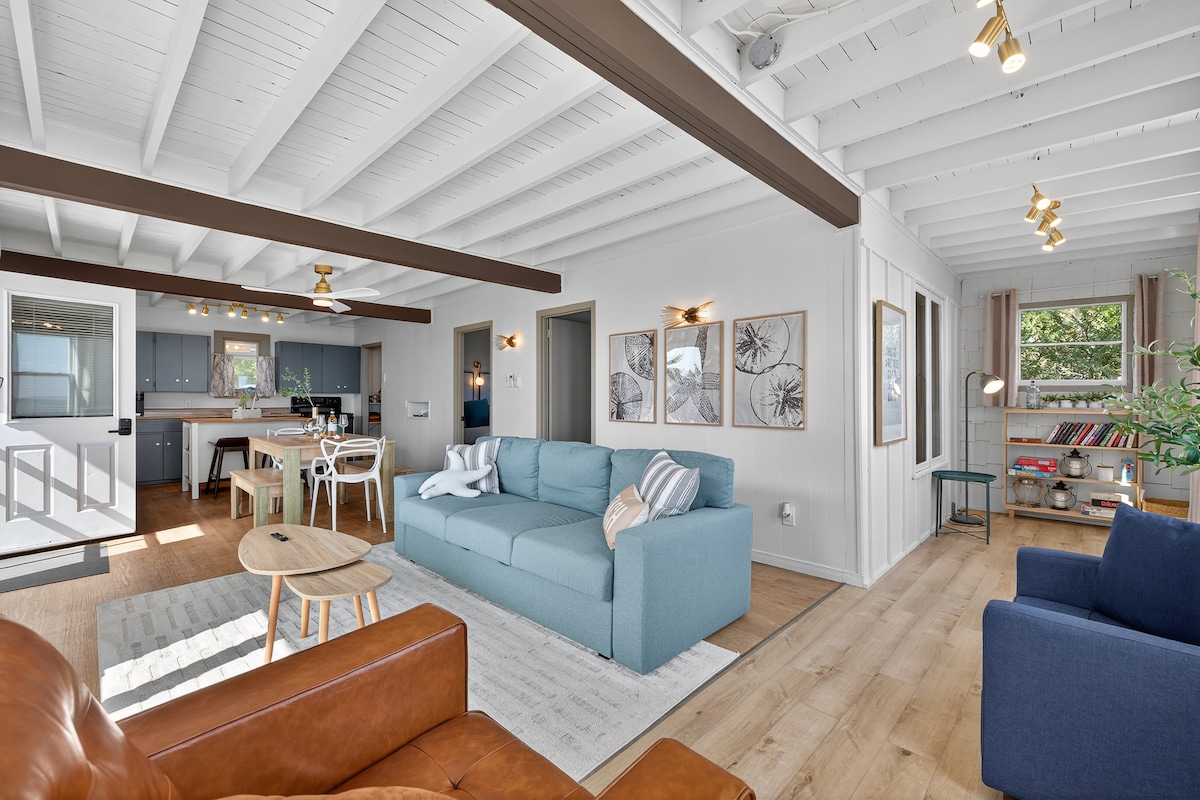 Directly on the beach, and across from a lagoon, the sights are breathtaking. Long walks on the beach, and beautiful sunsets are what you will find here. Also close to everything, within a 5-10 minute drive. Two bedroom beach house with all of the amenities. King bed overlooking the beach, and bunk room views the lagoon. Plenty of space, with two living rooms. Sweet, fresh air and beach waves.