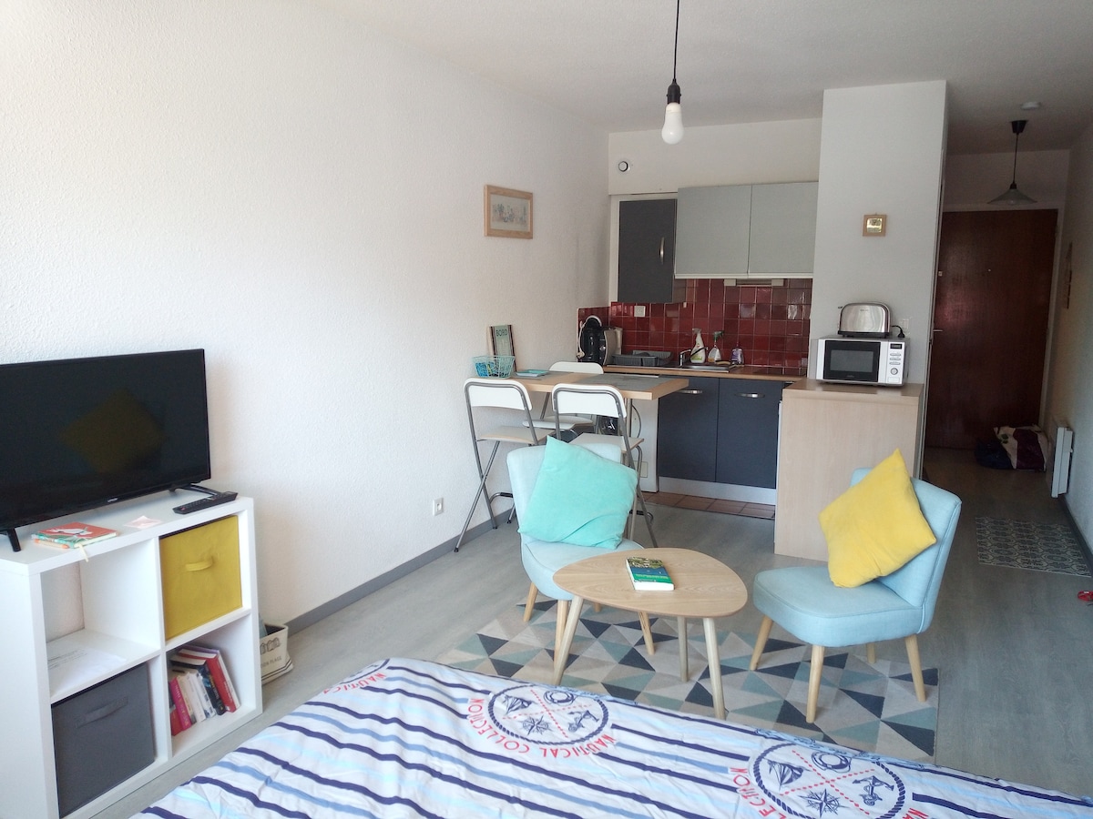 Ideally located 200 meters from the pier, close to all amenities, beaches, large sunny studio on the first floor, quiet and very comfortable, fully equipped and refurbished. Radio loudspeaker internet blue booth and smart tv 32 ". Possibility of storing bicycles in a private courtyard, free parking at 50 meters.
