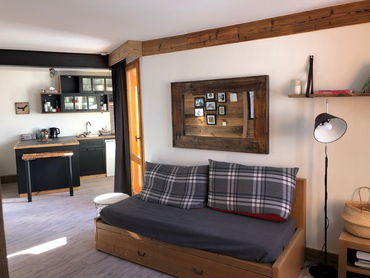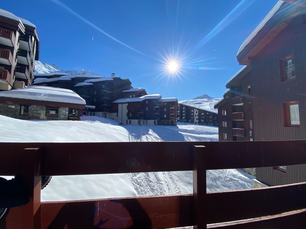 ❤️Appartement 5 personnes à Belle Plagne❤️, rénové: 1 chambre + séjour 3 canapés lits + Cuisine+ Salle de Bain + WC, à 2050m d'altitude. Exposé Sud Agréable balcon plein Sud, vue sur les pistes Café Nespresso Draps et serviettes disponibles en supplément ♡ Localisation parfaite! ♡ Ski à pieds (Sur les pistes, sans porter ses skis), casier à ski. Appartement très proche des commerces, meilleur emplacement (Centre Bas de Belle Plagne) au sein d'un des plus grands domaines skiables du monde