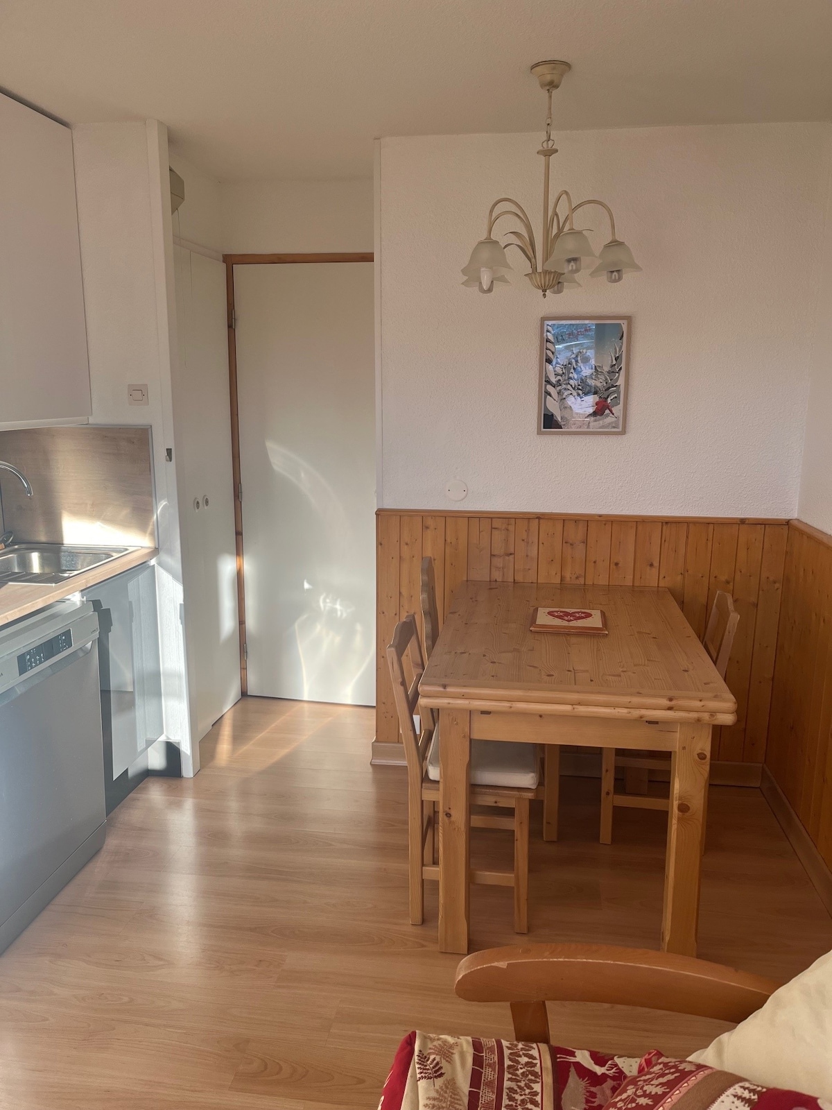 Appartement avec parking à Belle Plagne, 32m², excellent état, sud-ouest, belle vue montagne, classé 3* et 4 cristaux paradiski pour 4 pers. mais aménagé pour 6 pers., comprenant : séjour-salon avec belle cuisine aménagée (lave vaisselle, grand réfrigérateur...), canapé d'angle transformable en lit, TV écran plat, table avec 4 chaises et 2 tabourets, une chambre avec lit (140x190) et lits superposés (80x190), salle de bains, wc, grand balcon, casier à skis. Internet. Accès direct aux pistes.