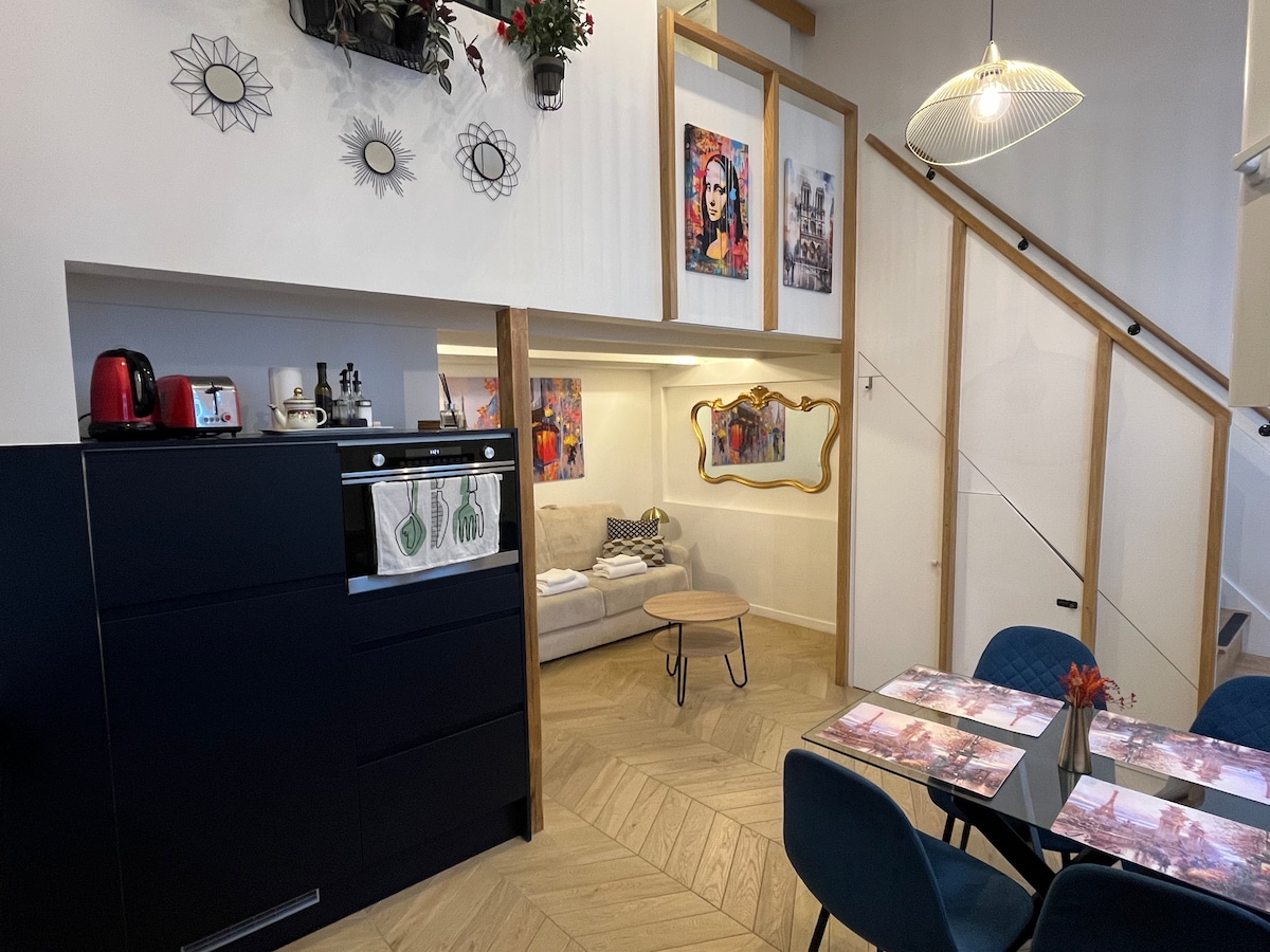 Duplex type loft avec grande terrasse paysagée au pied des buttes Chaumont et à quelques minutes seulement du centre de Paris ! Terrasse au calme et brumisée - Grand espace de vie ouvert sur l'extérieur - Cuisine toute équipée - Belle suite parentale - Lit King Size - Salle d'eau avec grande douche - WC séparé - Décoré avec soin par designer. Malheureusement l’appartement n’est pas adapté à l’accueil d’enfants.