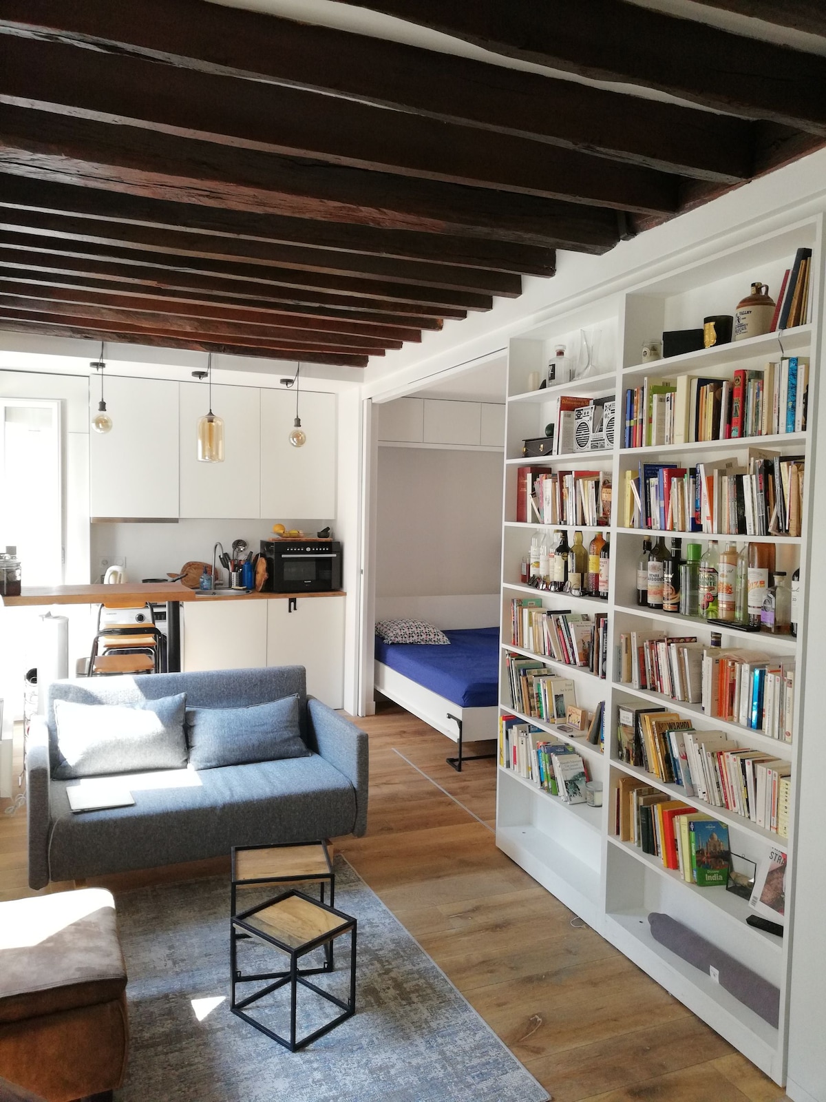 Ideal for 2 people, can accommodate 4. 35m2 1 double bed + 1 convertible sofa for 2 in the living space. The sleeping space with the double bed can be isolated from the living room by a sliding bookshelf. Parking lot, on request (next door basement) - add 20e/night (tbc) Come and spend some delightful days in our cosy and quiet apartment in a neighbourhood that rocks.