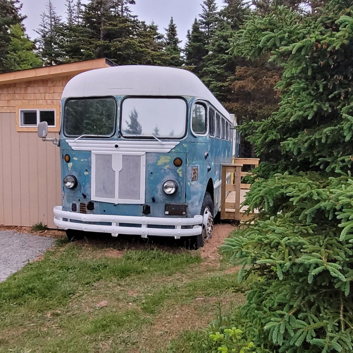 Stay in a beautifully restored 1952 Western Flyer Military Bus transformed into a cozy glamping retreat. This unique stay blends vintage character with modern comfort, featuring heat, A/C, running water, a shower with propane on-demand hot water (short showers recommended), and a compact mini kitchen for simple meals. Thoughtfully designed inside, the Blue Moon Bus offers a warm, memorable space to relax and experience a one-of-a-kind stay.