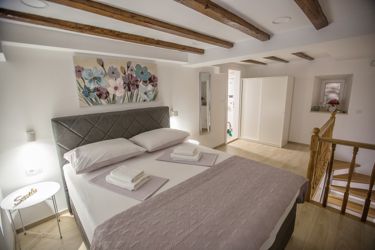 The apartment is well located, 15 minutes walking distance from Old City, surrounded by rocky beaches less than hundred meters far, and the pebble one around 200 m. Small terrace in shadow of Olive tree and Pergola, Flower garden, peacefull area ... Regarding very small separate room, apartment is perfect for two adults or family with two children or young people who don`t mind sleeping on bunk bed .
