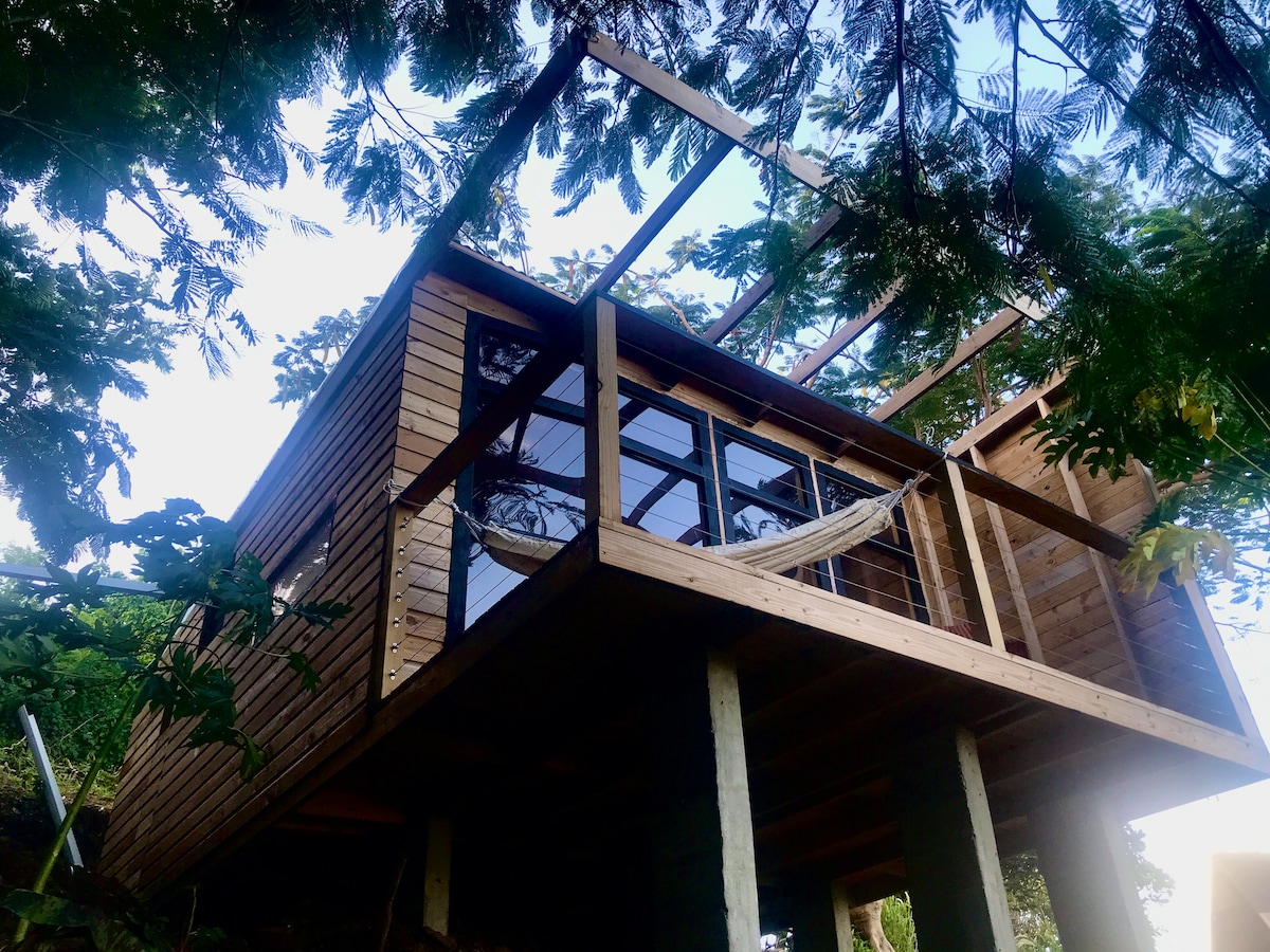 Our whimsical take on the tiny house craze is a gorgeous, rootsy yet modern getaway amidst mango trees and fresh vegetation. An open floor plan makes it feel anything but tiny inside. Our spice island hideaway has all the comforts of home, including a fridge, stove, microwave, flat screen tv, washer/dryer & wifi. Matching bright Caribbean colours with the comforts of home, Miss Tee's Tiny house is a Spice Island Treat just off the beaten path :)