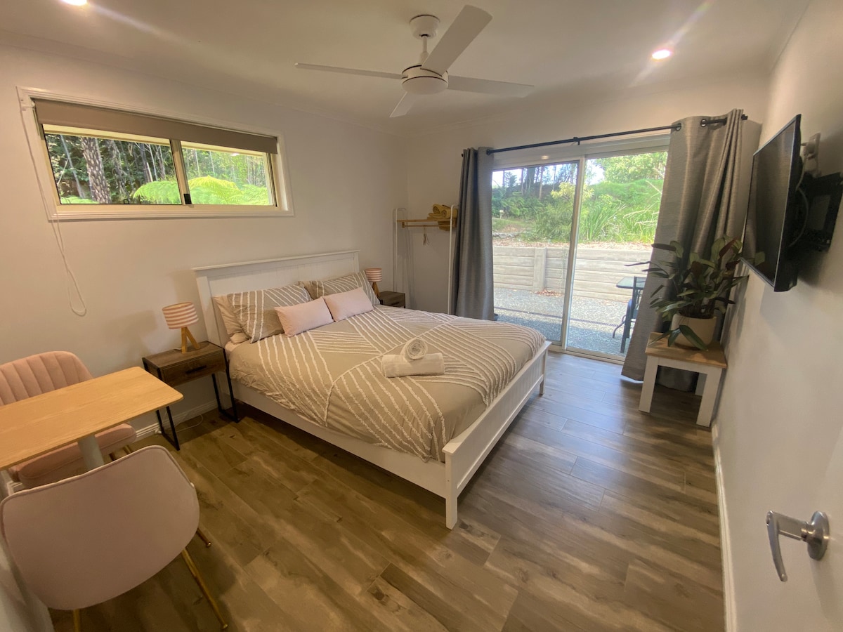 Beautiful 1 bed studio apartment set on a lush, quiet 2.5 acre block surrounded by nature. Only 5 min North of Coffs Harbour centre, close to beaches, shops & tourist attractions, but you could be miles away! Air conditioning, ceiling fan, kitchenette, BBQ, ensuite, large deck, all with magnificent panoramic views of the Korora basin valley. Plenty of parking for boats or vans & only 1 min off the highway. A great relaxing space for solo adventures, business travellers or romantic getaways.