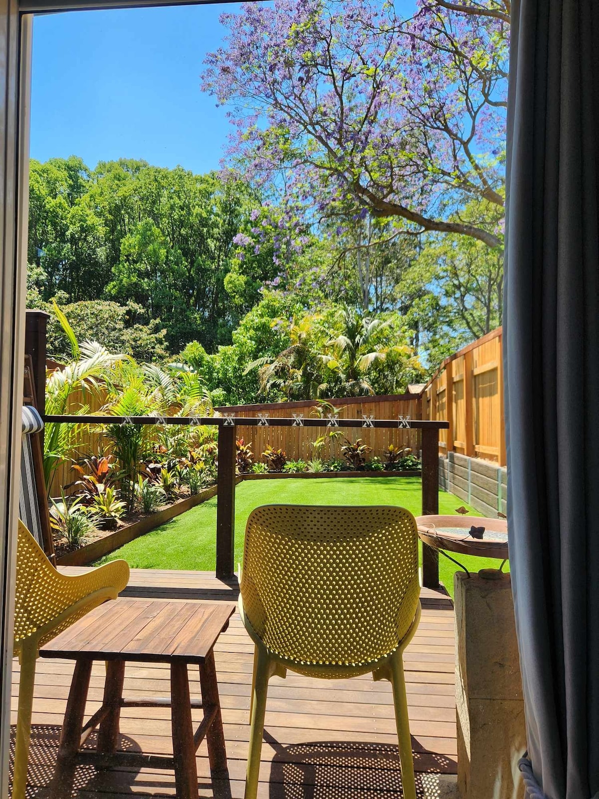 Bello Away is located in our back garden. This self-contained TEENY TINY home with attached covered bamboo verandah has all you need for your stay. A comfy double bed, fresh cotton sheets, doona, bathtowels, tv, microwave, fridge, electric 2-plate cooker and washing machine. The verandah has a lovely chilled vibe. Relax and enjoy your morning coffee, or take a leisurely stroll to town (12-15min walk/3 min drive) to the many vibrant cafes, pubs, boutiques and a plethora of culinary delights.