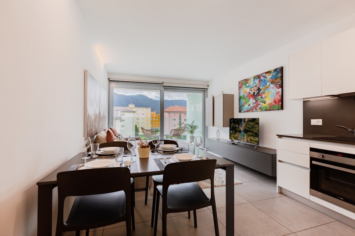 Enjoy a stylish and peaceful holiday in a modern and bright flat with all the necessary comforts, consisting of 2 rooms, veranda, open-plan kitchen, modern bathroom, air conditioning, laundry room. Monte Carasso is 2 km from the town centre of Bellinzona. From here you can reach the footpaths to the Ponte Tibetano Carasc and the Monte Carasso-Mornera cable car in just a few minutes. A convenient footbridge connects you to Bellinzona and its castles. Parking spaces in the blue zone at 50m