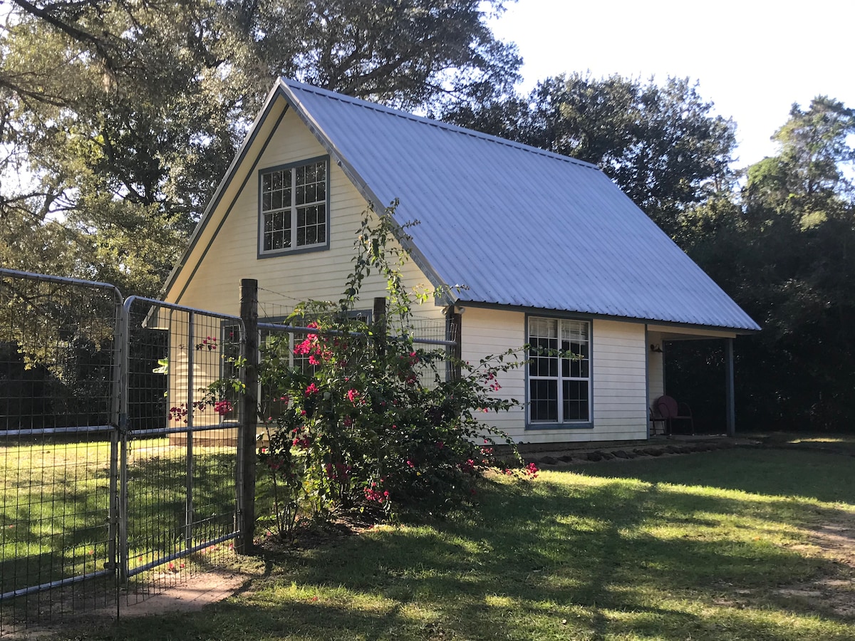 The Cottage at Crazy K Farm is a guest house situated next to a non-profit animal sanctuary in rural Hempstead. Our cabin is original to the property and has been updated to offer modern amenities and a warm, rural, old-Texas ambiance that reflects its original cattle-ranch roots. Wake up to the calls of roosters and guinea fowl, or maybe even a little songbird tapping on your window! Proceeds from your stay support the animal sanctuary.
