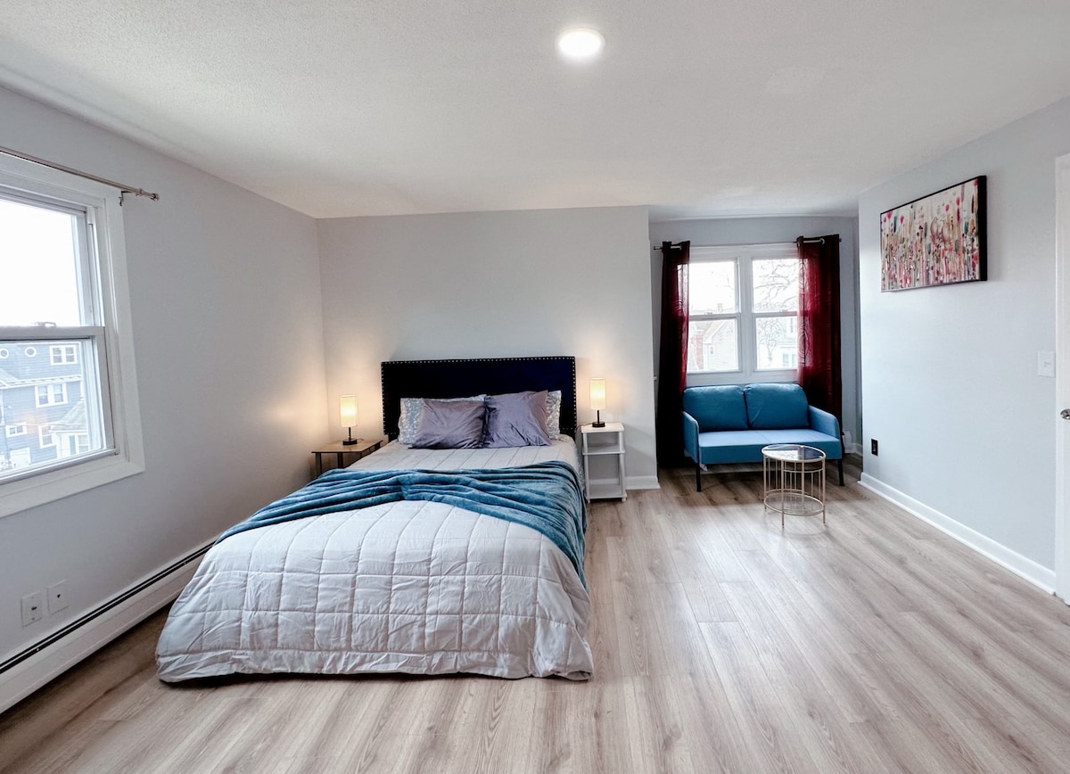 Located minutes from Tufts/Somerville, Cambridge, and Boston. This recently renovated flat offers a spacious, chic, open concept design with hardwood floors, lots of natural light, blackout shades, and glass markerboards. Modern kitchen equipped with stainless steel appliances and coffee machine. Stylish living room features a 65" flat screen smart TV, floating shelves, and adorable couch. Comfy bedroom offers a memory foam mattress, powered stand-up/sit-down Uplift Desk, and foldable treadmill.
