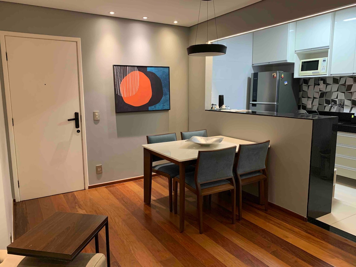 Lugar único, tranquilo e do lado da Savassi. Apartamento NOVO, com 2 suítes e lavabo. Finamente mobiliado, cozinha americana equipada com toda gama de utensílios. 1 Vaga Garagem Suíte 1 - Cama Box Queen, Smart TV, Ar condicionado Suíte 2 - Cama Box de Casal, Smart TV, Ar condicionado Amenidades: Cafeteira Nespresso Airfryer Lava e Seca Tabua de passar Ferro a vapor Secador de Cabelo Processador Liquidificador Climatizador Espremedor de Fruta Misteira etc. Roupa de Cama 200/400 fios