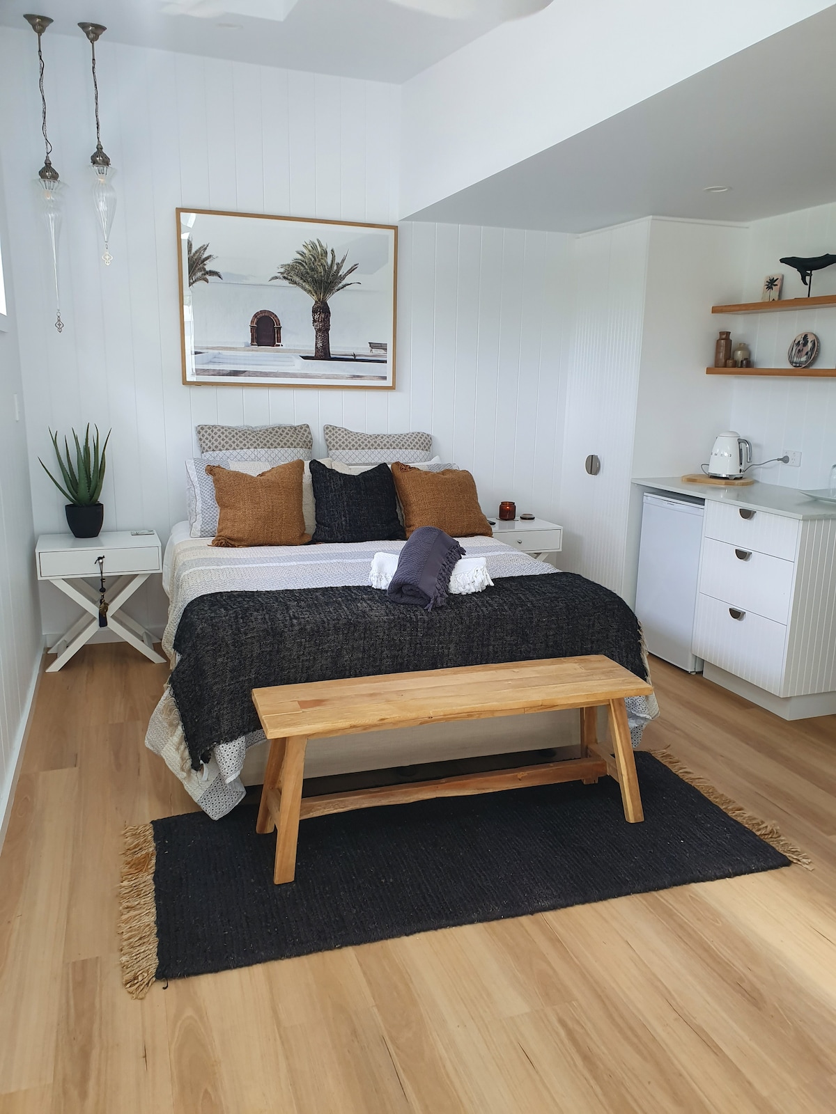A calm stylish space. Designed for the discerning traveler, best suited for couples, singles or small families who want to be spoilt in this beautifully appointed studio space. Wake up to beautiful natural light & freshly ground coffee from the espresso machine, OR stroll to the shops via the beach. There's a seamless flow from outside in, with the alfresco bar linking courtyard to kitchen, perfect anytime. Finally finish a perfect day in king bed luxury, made with the finest linen