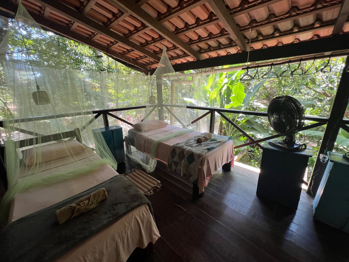 Em Alter do Chão. Bairro Jacundá. 1.7 Km do centro. Rua não pavimentada Área pouco movimentada e pouca iluminação a noite. 2 quadras parada de ônibus. 6 minutos a pé da praça do Sairé. Até 4 pessoas (1 cama de casal, 1 rede, 1 colchonete solteiro). Wi-Fi. Chuveiro quente. Roupas de cama e banho. Estacionamento não coberto. Não é recomendado para crianças pequenas (escada). Não inclui café da manhã . Não inclui serviço de quarto. Não inclui sabonetes. Não é permitido pet