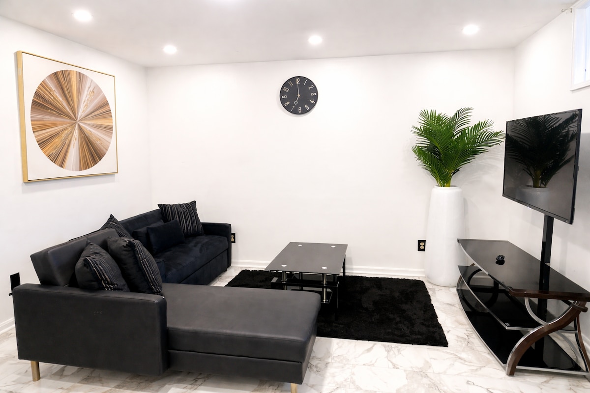 We welcome you to a spacious and private basement apartment with its own entrance and self check-in. Get cozy with your guests in a space that has a bedroom with a king-size bed, an 85-inch smart TV, soft sectional , private toilet, bathroom and kitchenet, all in the same space. None of the amenities are shared. The fully-equipped kitchenet has everything you'll need to cook and warm your meals. Guest suite is the entire basement apartment which is a part of a bigger home where host lives.
