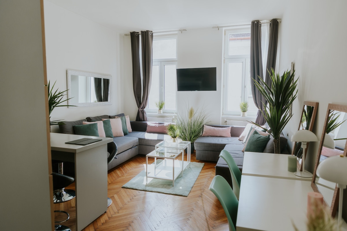 Unser im 5. oder 6. Stockwerk befindliches Red Studio mit ungefähr 34m² hat, wie der Name schon sagt, einen leichten roten Touch und eignet sich perfekt für Businessgäste oder Wien-Entdecker. Trotz der sehr zentralen Lage findet man sich hier in einer grünen und ruhigen Umgebung wieder und kann dadurch sowohl entspannen, aber auch schnell mitten ins Geschehen losziehen. Durch die Vollausstattung sollte jeder Gast bei uns alles finden, um sich praktisch wie zu Hause zu fühlen.