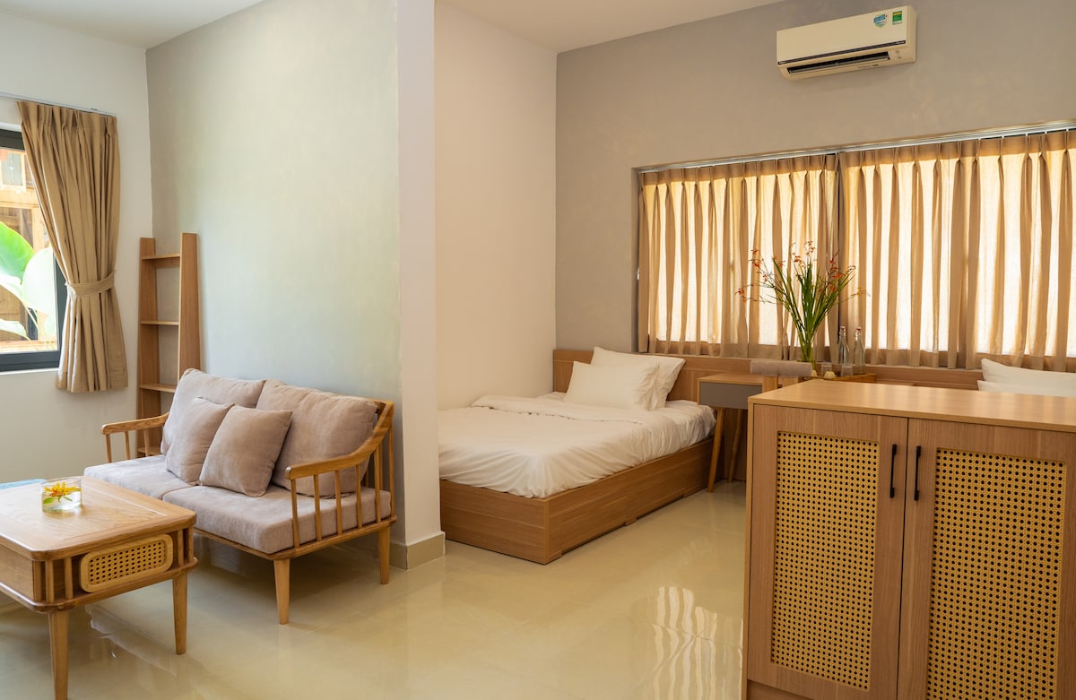 Designed in a simple black-and-white style, the Deluxe Studio offers a clean and modern living space with soothing minimal aesthetics. The room features two single beds (1.2 m x 2 m), along with a TV, sofa, dining table, and a fully equipped kitchen with cooking utensils and a large refrigerator. The bathroom includes hot water and an exhaust system. Guests enjoy daily housekeeping, daily breakfast, access to a swimming pool and gym, plus 24/7 front desk service.