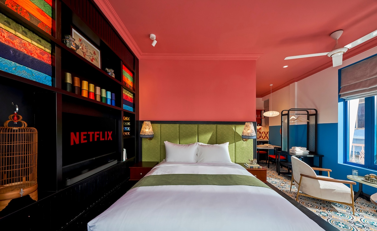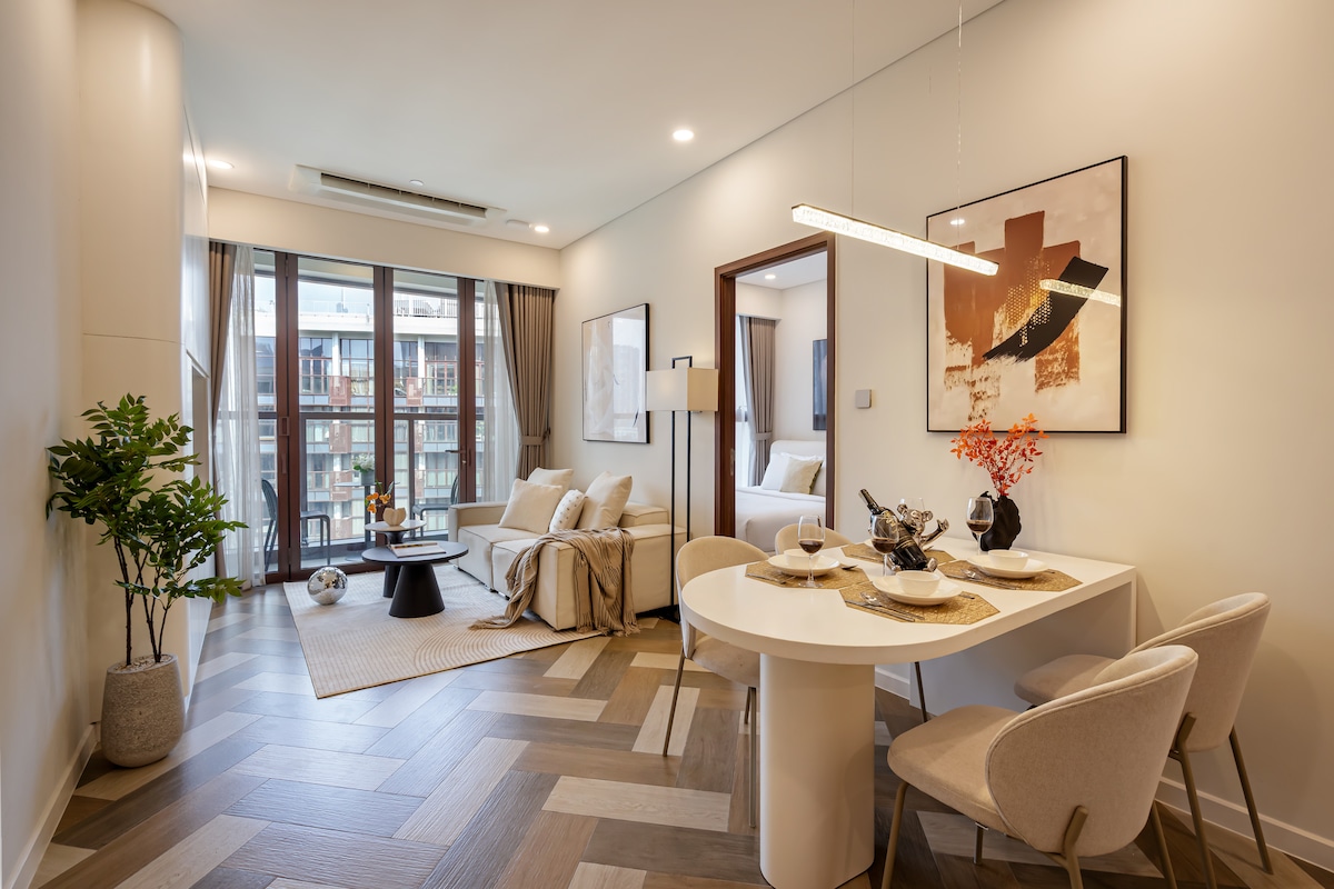 Unwind in spacious 45m2 stylish 1-bedroom hideaway for two, featuring a wide-view balcony right in vibrant Japan Town, just 5 minutes from Saigon’s center. Surrounded by restaurants, bars, cafés, massages, and 24/7 convenience stores — all just a few steps away. Perched on 1st floor, this Japandi-inspired retreat is fully equipped for comfort. 55-inch smart TV for epic movie nights with Netflix & Youtube, whip up your favorites in the kitchen, and freshen up in a sleek, hotel-style bathroom.