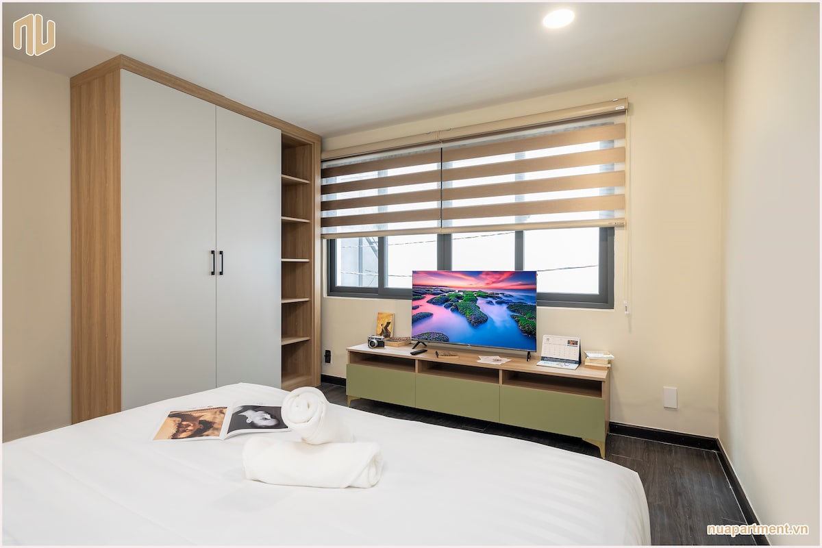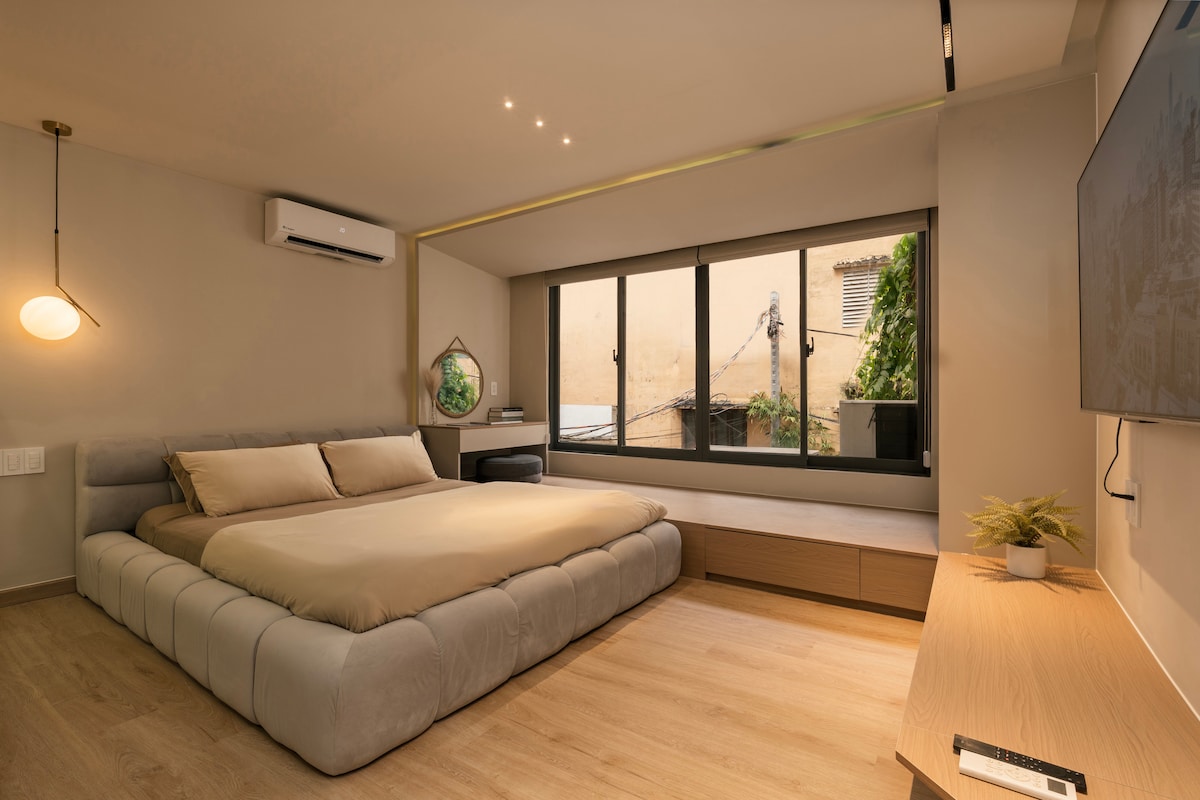 Welcome to Your Urban Oasis! Relax in our 1-bedroom apt for 2 with a wide-view balcony in Japan Town, just 5 minutes from HCM center. Restaurants, bars, cafes, massage spots, and convenience stores are all within a 1-200m walk. On 3rd floor, your Japandi paradise has full amenities. No elevator, but the wide and gentle stairs are a free workout! 💪 Enjoy a 100-inch projector for movie nights, a cozy 1.8m sofa, a fully-equipped kitchen, and a refreshing bathroom.