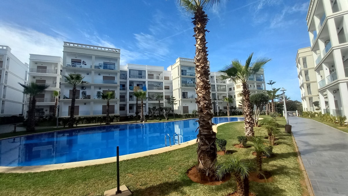 Important : pour chaque réservation je vous offre le petit déjeuner au @poundsfitkitchen le meilleur restaurant de la ville. Très bel appartement neuf dans une belle résidence calme l’appartement est seul à l’étage avec vue sur piscine . Idéal pour voyageurs et familles désirant profiter des belles plages de mohamadia. Ils y trouveront leur bonheur avec l’accès au piscines et aux différents airs de jeux pour enfants ainsi qu’aux terrains de tennis et football.l’accès à la plageà 5 min à pied