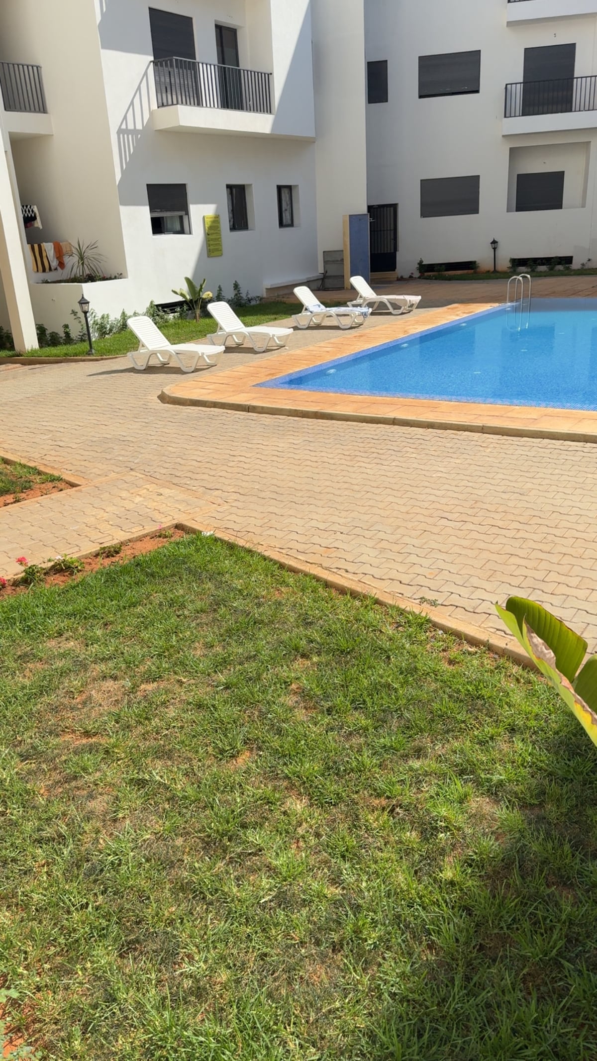Beau Rez de jardin,,au sein du complexe balnéaire Bahia Golfe Beach ,comprenant 3 chambres,salon spacieux climatisé,2sdb,cuisine bien équipée,toute les pièces donnent sur jardin et terrasse offrant fraîcheur et ambiance chaleureuse au logement . Fibre optique.2 bicyclettes à votre disposition. Une belle piscine disponible toute l année . Accès direct à la mer, une corniche aménagée de 3km , plage privée,hôtel Vichy,Golf club House MARJANE à proximité même des livreurs Glovo Mc Do sont dispo