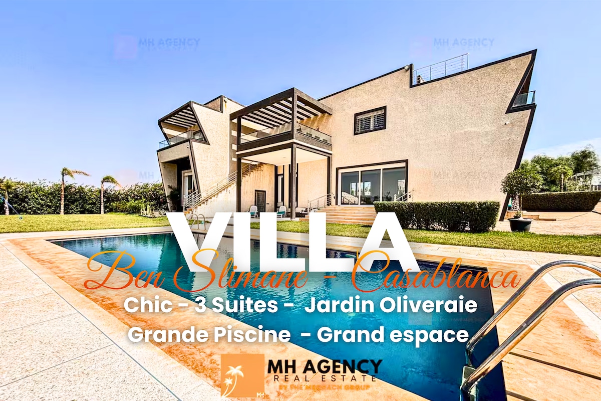 Détendez-vous dans ce logement confortable, chaleureux, unique , paisible et spacieux . Situé En pleine Nature ❤️Dans les environs de la belle ville de Benslimane , Doté d’une grande piscine (15/7) et d’un très beau Jardin , un véritable havre de paix où il fait bon de vivre et de se retrouver en Famille ou entre amis ! C’est une villa de 2 étages qui dispose de : -3 chambres climatisées chacune avec sa salle de bain , -cheminée -cuisine bien équipée - 2 grands salons climatisés et hall