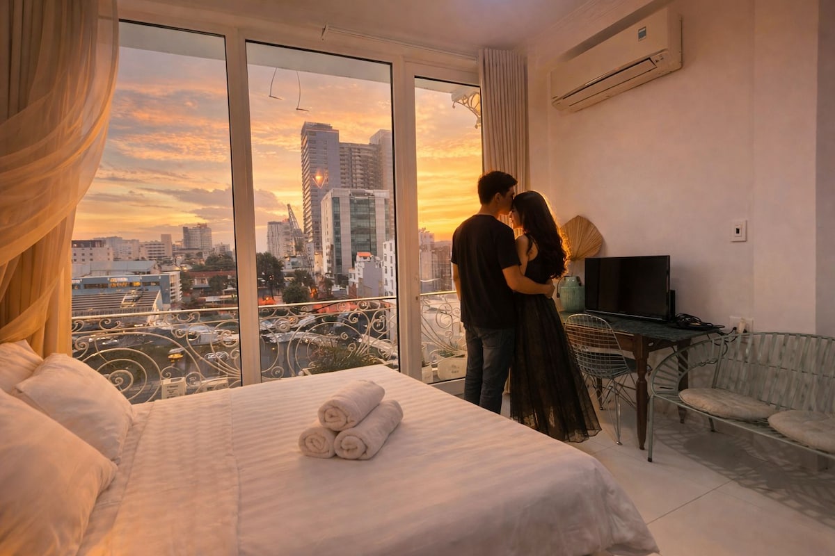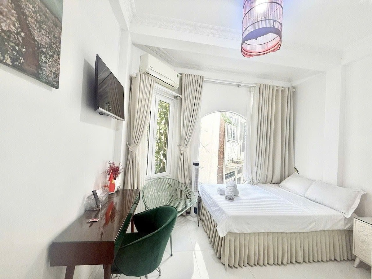 This amazing balcony suite is comfortable & large to stay in short or long term. It's on 1st floor. - Add: Nguyen Dinh Chieu st, District 3 - 5min to District 1 - Double bed (soft to sleep well) - A small balcony, big window - Kitchen: induction cooker, fridge, kettle, pot, bowl, dish, cup... - Private bathroom: bathtub & hot shower - Elevator, TV & cable, air-conditioner, wifi, wardrobe, table, chair, safe box... #FREE cleaning & parking #FREE 2 water bottles Reception will help guest check in!