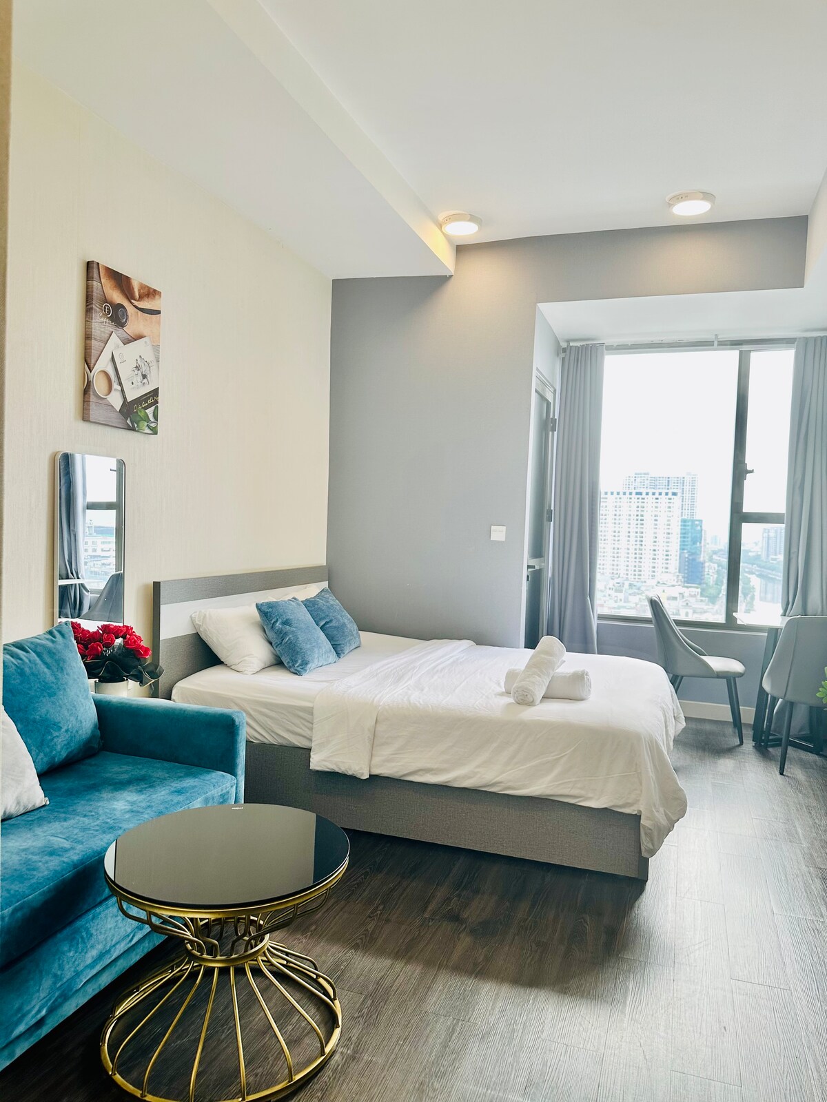 This 68m2 apartment is located on the 28th floor of a new, high-end building in District 1, with beautiful million-dollar views of the sunset, skyline and the entire city. Located in a prime location in District 1, only 200 meters from Bui Vien Walking Street, 300 meters from Ben Thanh Market and close to major shopping centers. This suite is designed like a home away from home, featuring a cozy space and 2 bedrooms (King size),all with windows,and 1 bathroom.