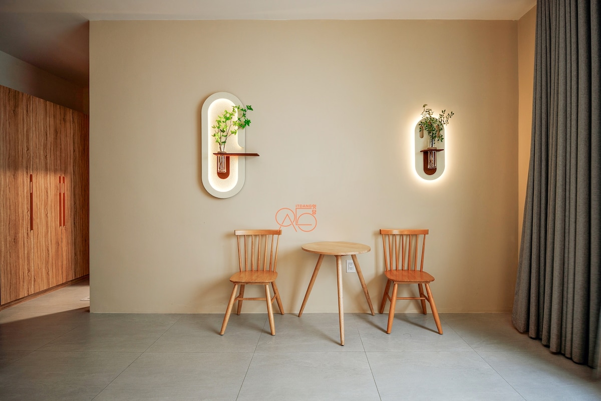 Room 101 là một căn studio tiện nghi nằm ở vị trí tuyệt vời, cách sân bay 3 phút di chuyển và cách trung tâm 10 phút. - Căn phòng được thiết kế với phong cách japandi với full ánh sáng tự nhiên, nội thất gỗ và được trang bị đầy đủ đồ dùng bếp đem lại cảm giác ấm áp như ở nhà - Nằm trên tầng trệt với cửa đi riêng, rất riêng tư và dễ dàng mang hành lý vào. - Phòng được trang bị máy chiếu hiện đại cài netflix giúp bạn dễ dàng xem những bộ phim hay như một rạp chiếu phim mini tại nhà.
