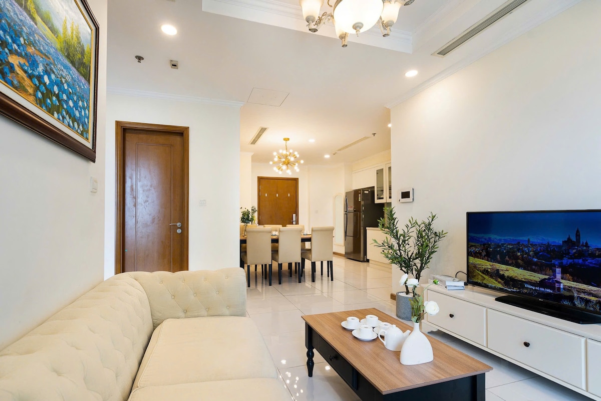 Elevated comfort and style in this luxurious 2-bedroom apartment, perfectly situated on a high floor with sweeping city views. Located near District 1, you're just minutes away from most iconic landmarks, including Ben Thanh Market, Notre-Dame Cathedral, Independence Palace,.. The apartment offers a quiet and peaceful retreat, perfect for families or groups of up to 4. It features 2 spacious king-size beds with high-end mattresses, complemented by elegant furniture and sleek modern appliances.