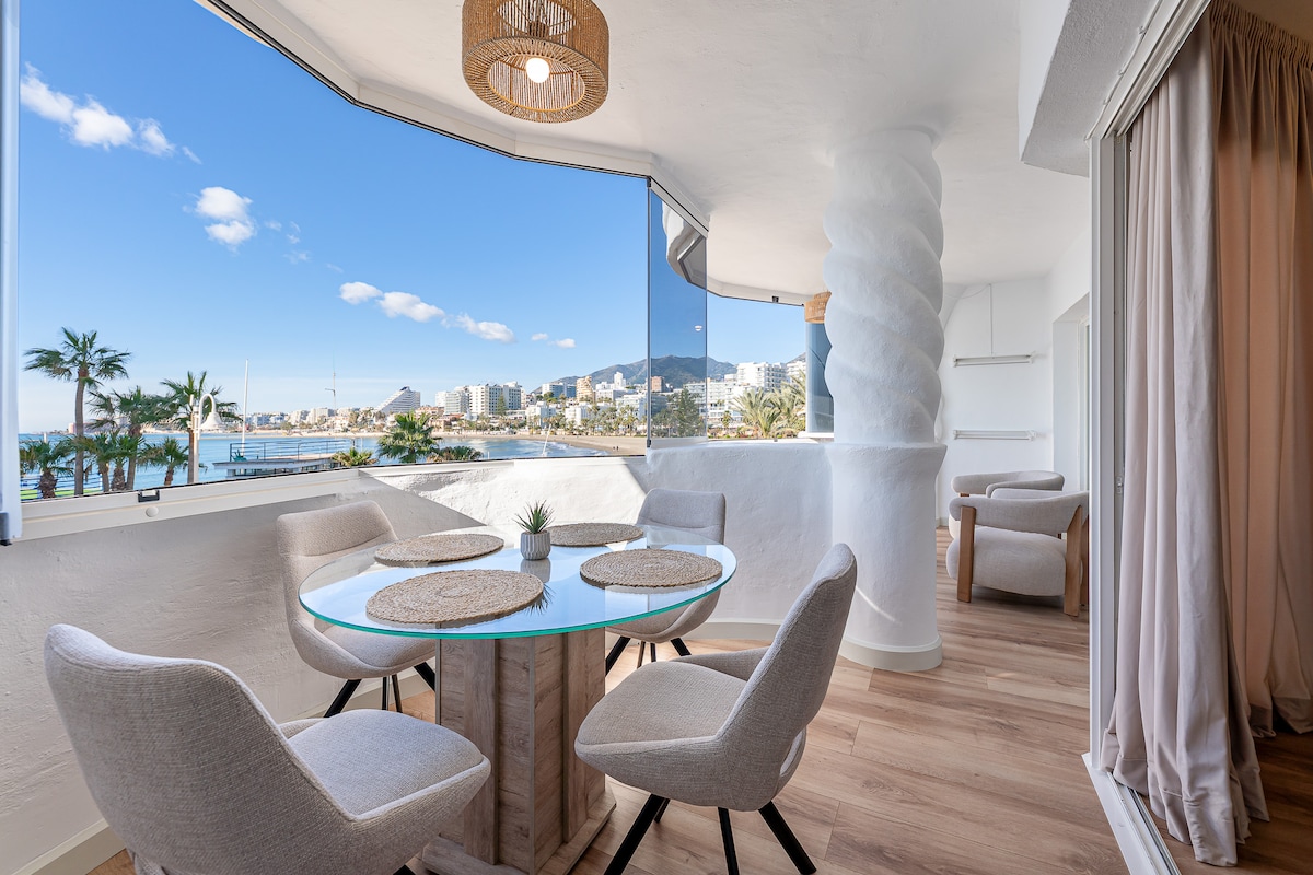 Modern frontline Beach penthouse in Ole Playa with stunning sea views. Direct access to the beach and the promenade, two minutes walk to the world famous marina "Puerto Marina", surrounded by all kind of services, public transport, restaurants, supermarkets, etc. Large south facing terrace, modern design, private underground parking, WIFI, large double bedrooms, fully equipped kitchen, large bathroom, 42 "TV , fantastic location, small 2 storey complex, first floor without elevator. Plaza Ole.