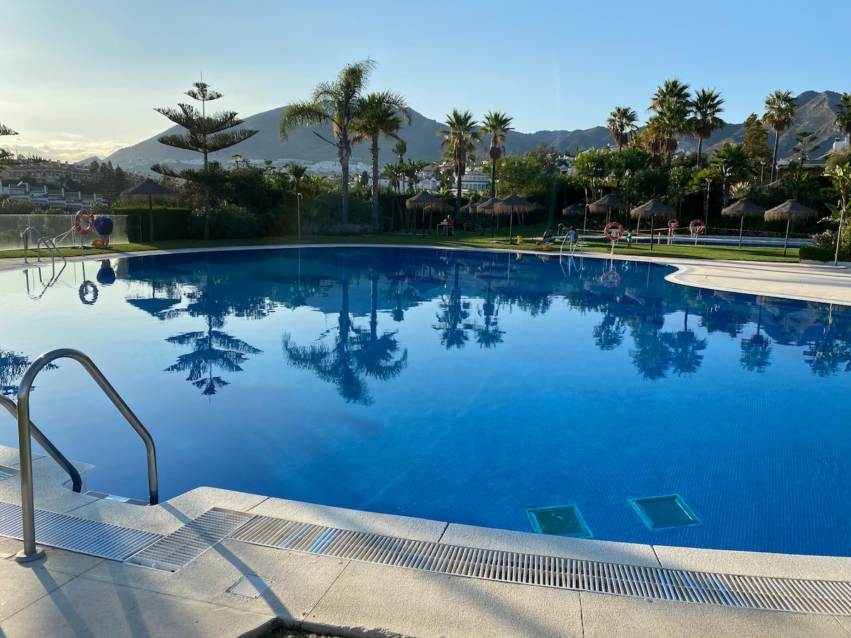 Spacious duplex with AMAZING SEA VIEWS, 100% refurbished with everything brand new. 2 bedrooms, one of them with King Size bed , 1 bathroom & a big living room with open kitchen. Nice terrace with espectacular views. 12 minutes away by walk from Carihuela Beach (3 min by car) and 15 minutes away from Málaga city. Excellent train connections with Malaga Airport and AVE Station (stop: Montemar Alto). Quiet area with nice gardens and swimming pool.