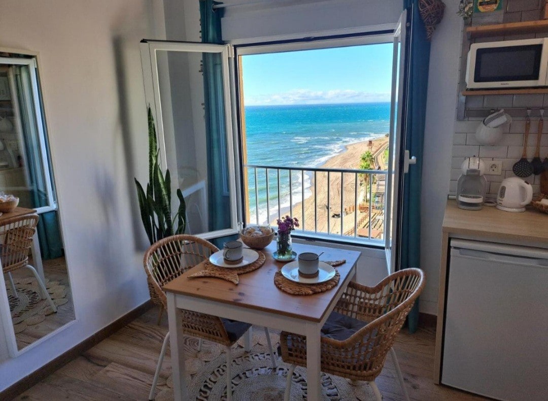Estudio luminoso y totalmente reformado. Maravillosamente ubicado a pie de playa y con espectaculares vistas al mar, a la playa. Es el enclave perfecto para relajarte. Despertarte por la mañana y ver desde la cama el mar y escuchar las olas romper en la orilla. Su maravillosa ventana es el corazón de este estudio. Te invita a asomarte y perderte en ese mar, en ese horizonte que se abre ante tu vista. Atardeceres impresionantes que puedes disfrutar cenando cómodamente.