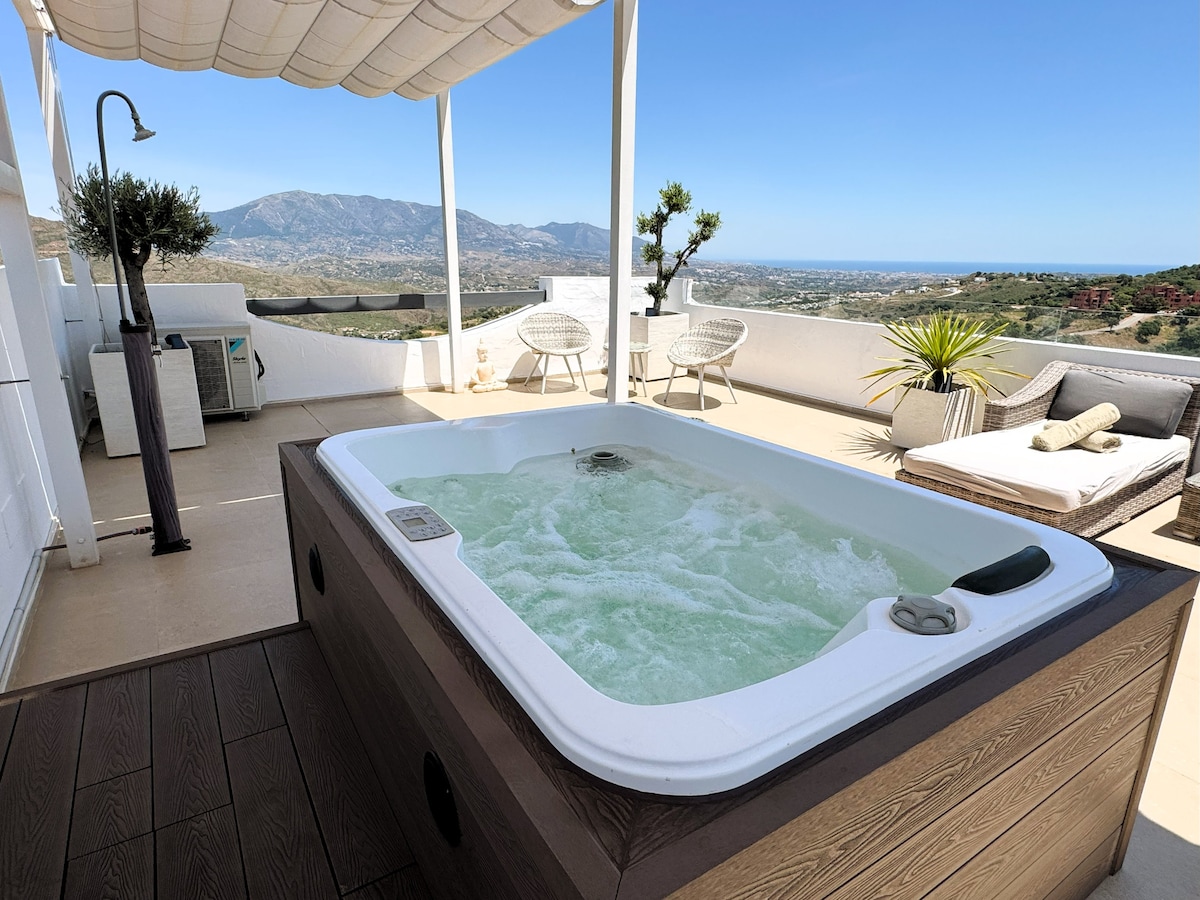 Brand New! A beautiful luxury penthouse located in the stunning village of Mijas Pueblo. * The Best Ocean & Mountain views that the Costa del Sol has to offer * Relax on your own private roof terrace including a hot tub, day bed & sunloungers. Both the roof top terrace and the dining terrace is a great space for entertaining, relaxing & enjoying the amazing sunset and views The penthouse has a luxury décor with open plan living, both bedrooms have sea views & comfortably sleeps 4 people