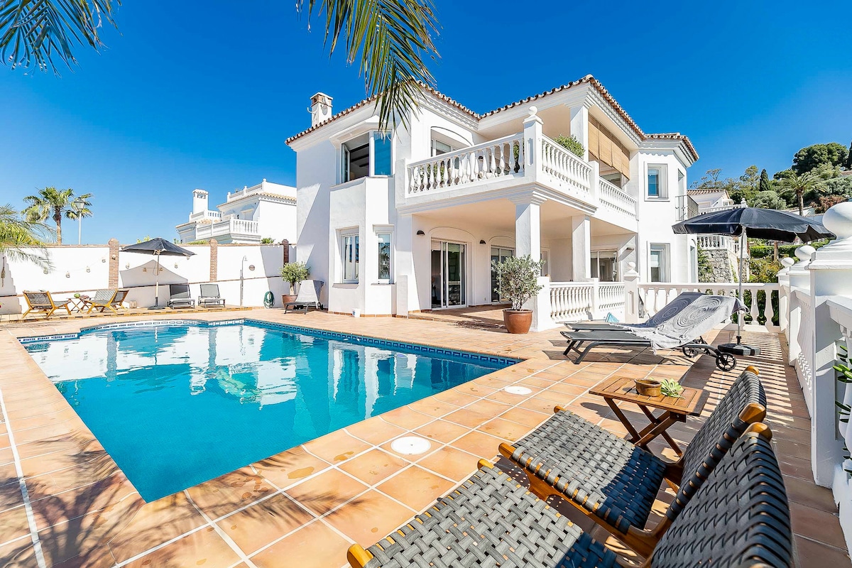 A modern and spacious villa(4 bedroom 3bathroom,4 beds)with amazing sea and city views, the best and safest place in the best part of town to spend your holidays with family and friends , the villa is located in a safe urbanization with 24 hours security. 20 minutes from Malaga International Airport and Marbella as well.Close to shopping centers. Drugstore, supermarket just 5 minutes walking. this villa has a fantastic Basketball court which is designed for Basketball lovers.