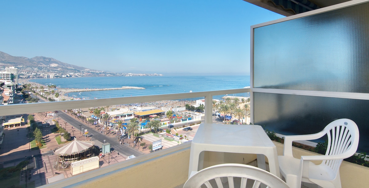 Sunny studio on the boulevard of Fuengirola, steps from the beach. Comfortable studio with air conditioning, Wi-Fi, TV, and fully equipped kitchenette. Sleeps 2 adults + 2 children or 3 adults. Located in a well-maintained 4★ hotel apartment complex with communal pool and children’s pool. Enjoy the 18 m² private sunny terrace, perfect for relaxing, dining, and enjoying the Mediterranean lifestyle. Walking distance to restaurants, shops, and nightlife.