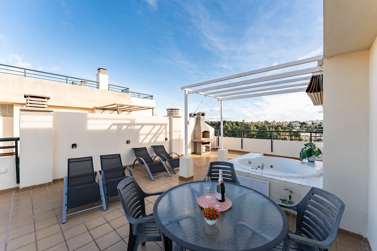 Brand New! A beautiful luxury penthouse located in the stunning village of Mijas Pueblo. * The Best Ocean & Mountain views that the Costa del Sol has to offer * Relax on your own private roof terrace including a hot tub, day bed & sunloungers. Both the roof top terrace and the dining terrace is a great space for entertaining, relaxing & enjoying the amazing sunset and views The penthouse has a luxury décor with open plan living, both bedrooms have sea views & comfortably sleeps 4 people