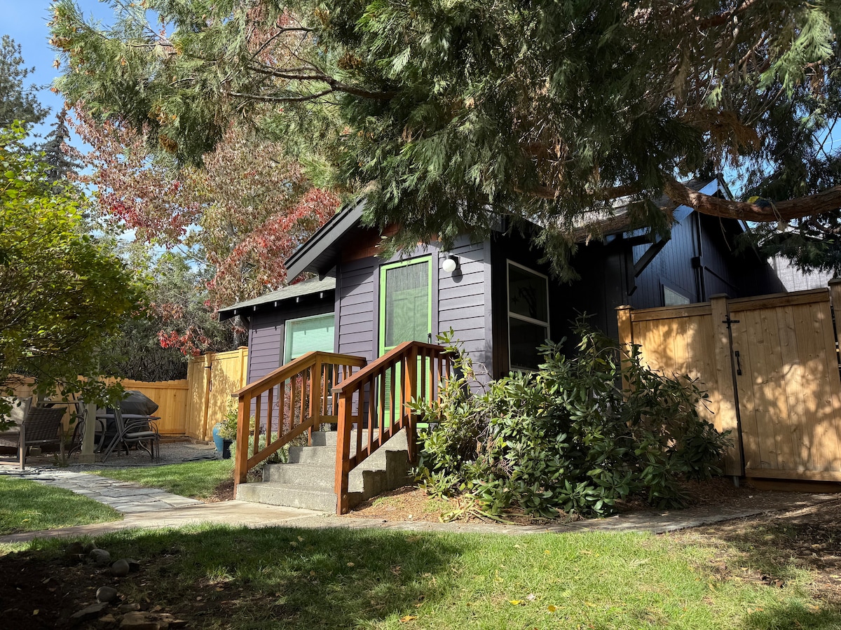 Keep it simple and take it easy at this peaceful and centrally-located, unique, cozy getaway. The Blossom Cottage Studio is located in a beautiful garden setting. ~The space~ • One Room Studio • 1 Bathroom • Full sized bed (additional cot if needed) •Kitchenette (Refrigerator w/small Freezer, Toaster Oven, Microwave, Blender, Kuerig, etc) •Short walk to the heart of downtown Redmond. The cottage is private and located on the back property of a Gift Boutique Shop and Bakery/Cafe.