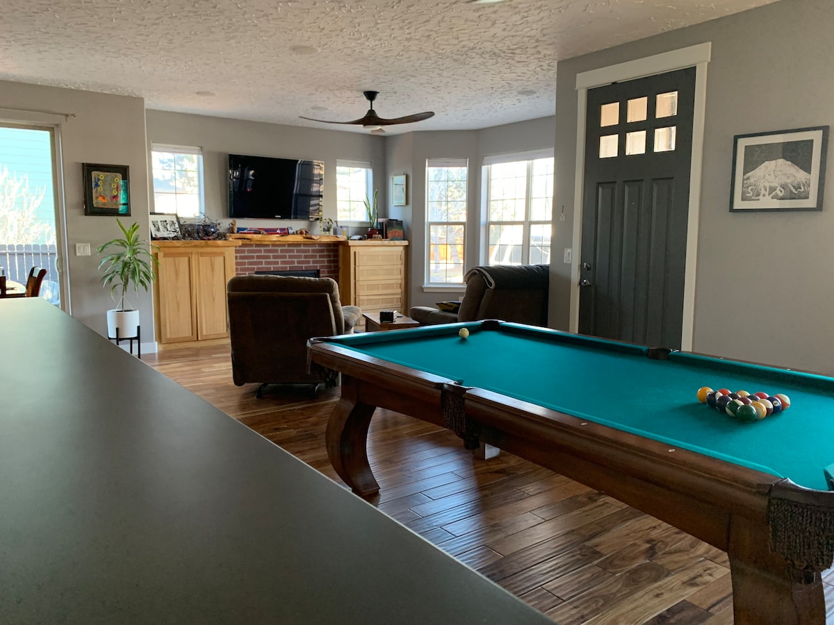 Looking for a home away from home while in Bend? This house is not just a place to sleep at night, it’s the perfect place to relax and have fun after your day of adventures. Perfect for both families and groups of friends. The game room is always a huge hit with guests, as is the hot tub. The large kitchen table is perfect for dinner as well as game night. Both TVs have surround sound speakers. Great access Bachelor (25 minutes). Close to Old Mill. Trail to the river right from the backyard.