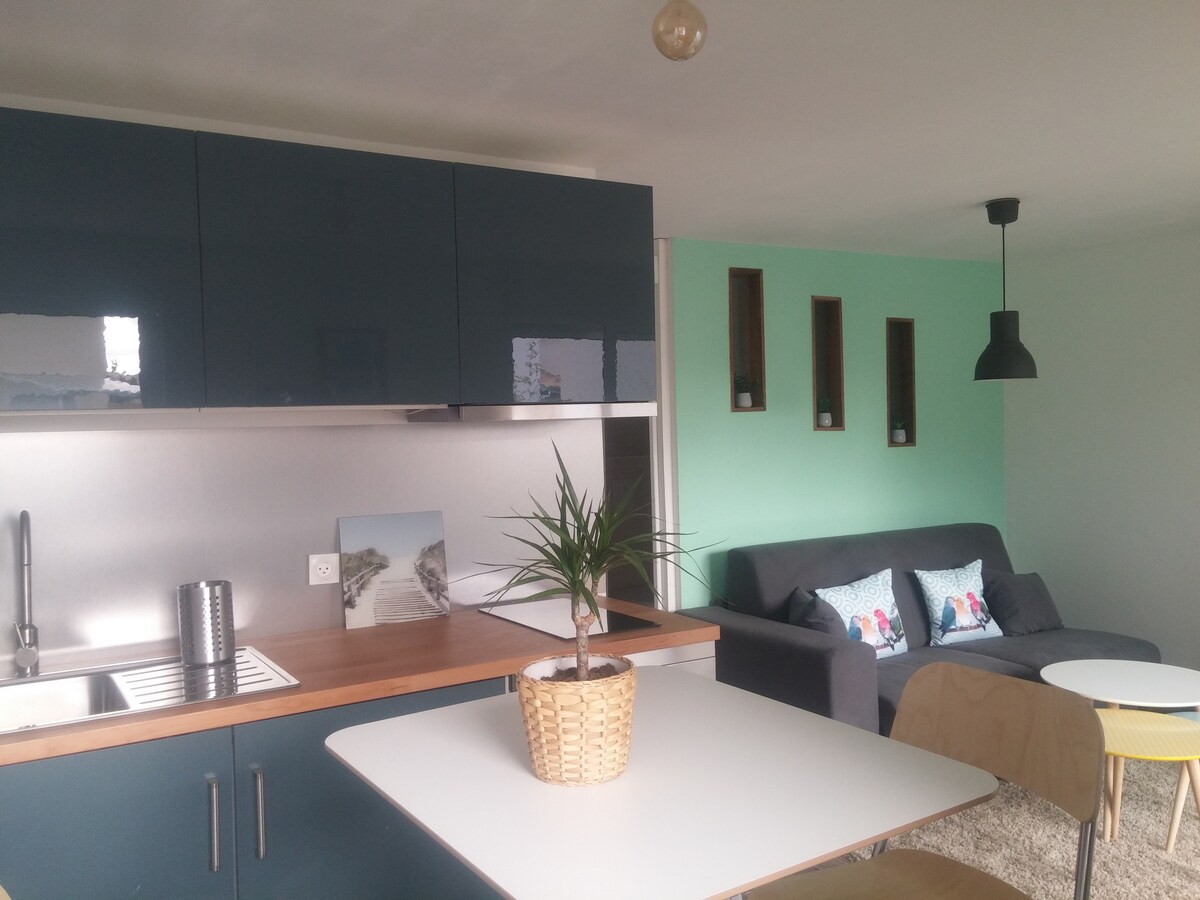 Nous vous proposons notre appartement T2, rénové et idéalement situé dans un environnement calme et très arboré. Situé au 3ème et dernière étage, il n'y a aucun vis à vis. Vous pourrez profiter des plages du lac et de l'océan. Le centre ville et la centrale sont à 5 minutes à pied. Tout est à proximité.