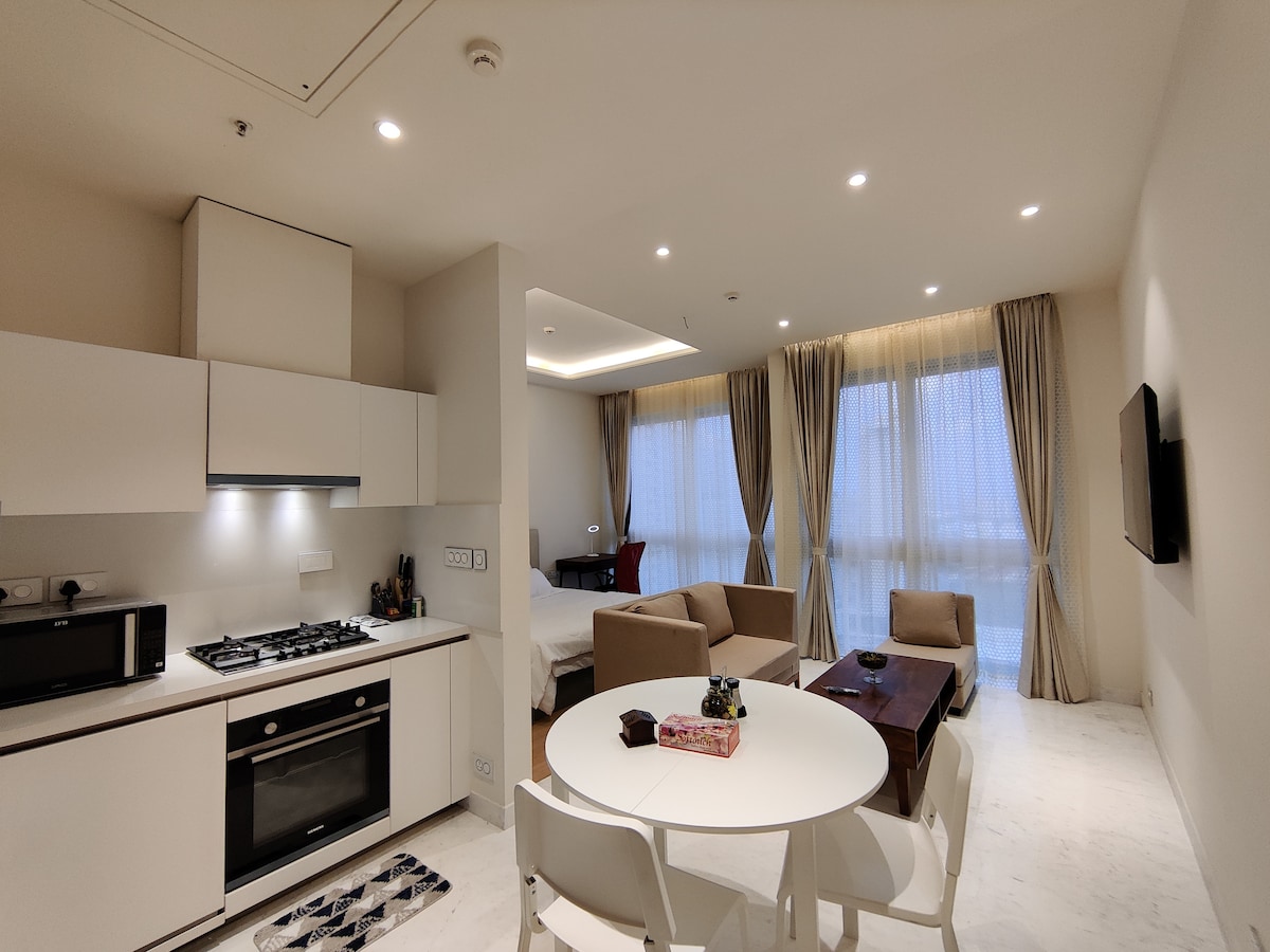 Welcome to our brand new, premium 1-BHK apartment, ideal for couples and travellers seeking comfort and privacy in an excellent central location. The bedroom has a queen bed with soft orthopedic mattress for a restful night's sleep. Relax in the cozy living room with a Smart TV, lightning-fast WiFi and open kitchen area. Comes with a super clean bathroom stocked with bath essentials. The fully equipped kitchen includes high-quality appliances and crockery for your culinary adventures!