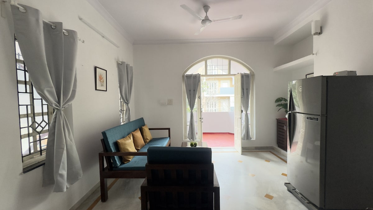 Parvati, a cozy one-bedroom home that offers a full-unit experience with all the amenities you need for a comfortable stay. Whether you’re visiting for work or leisure, it provides a peaceful escape in the heart of Bangalore, blending modern comfort with nature’s charm. Surrounded by a lush garden with a private portico, the home is designed with an antique theme, featuring a natural well, delightful poster bed and vintage decor that creates a warm, inviting atmosphere.