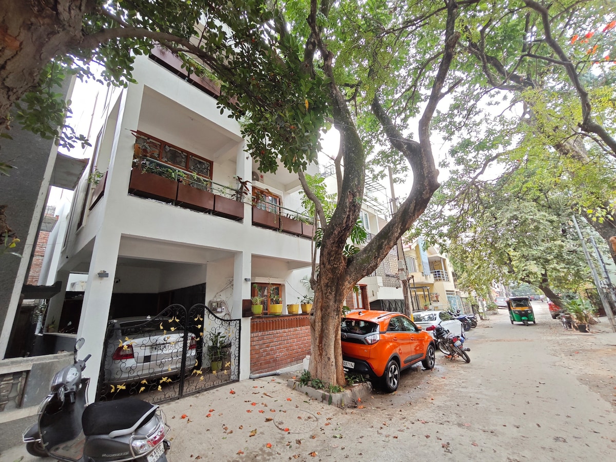 Welcome to our centrally located Airbnb! Newly built, hosting 4 guests in 2 rooms with 2 bathrooms. Enjoy lift access, open terrace, and kitchen amenities. AC in hall, fans in rooms. Toilet amenities provided. Close to 100ft Road Indiranagar, metro accessible in 5 mins. Order from Zomato/Swiggy. Car park available. Experience Bangalore's charm with metro views! The well-equipped kitchen features a stove, microwave, and fridge, allowing you make home-cooked meals. Looking forward to hosting you!