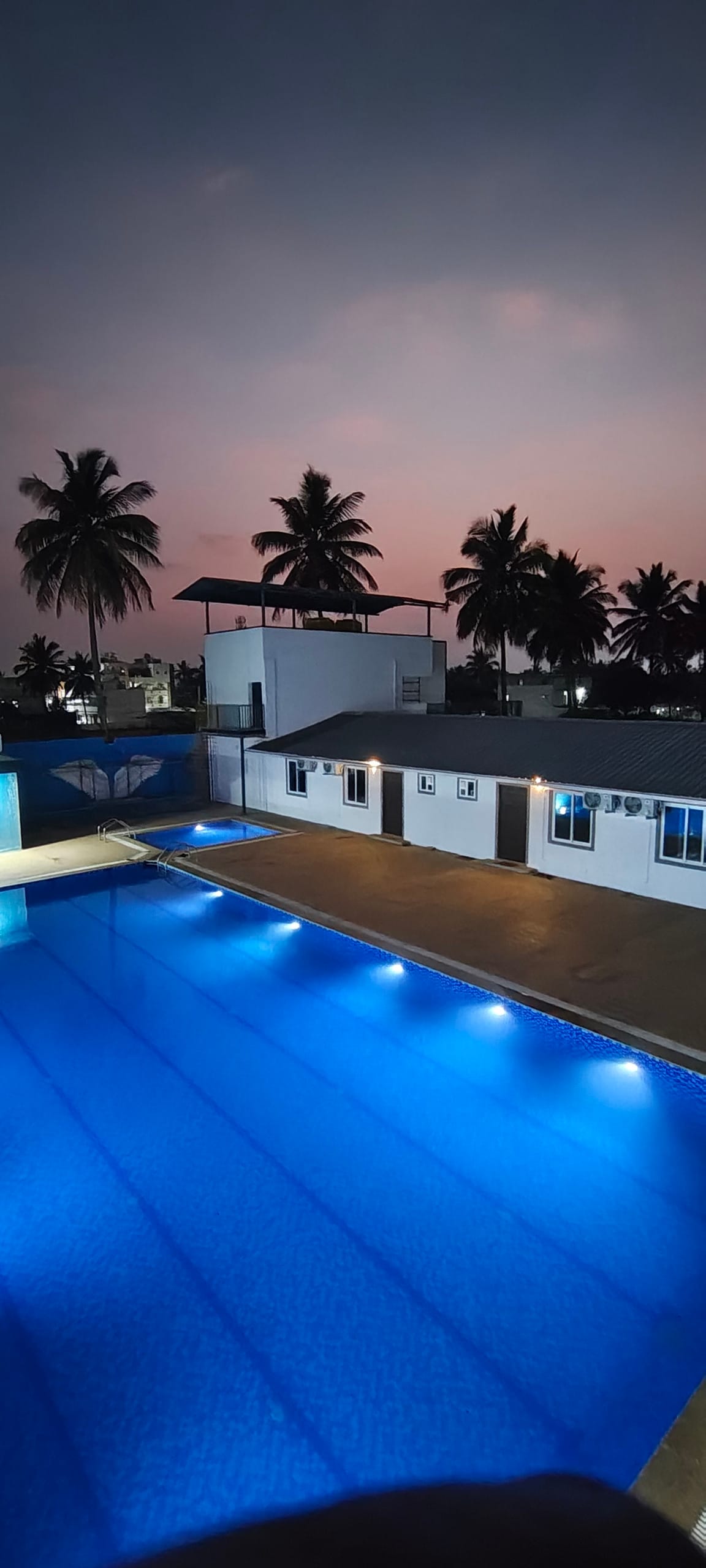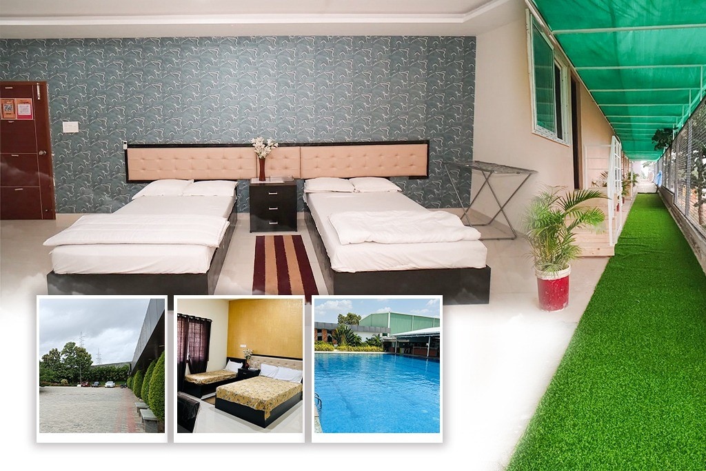 Our property offers you fully furnished rooms for accommodation, multi-cuisine restaurant, swimming pool, recreational activities, rain dance facility, health & fitness, party hall, open lawns, children’s play area etc. It is located just at a 45 minute drive from Bangalore city. It is an ideal place for weddings, parties, conferences, seminars, birthday parties, day outings, trainings, team- building activities, school outings etc.