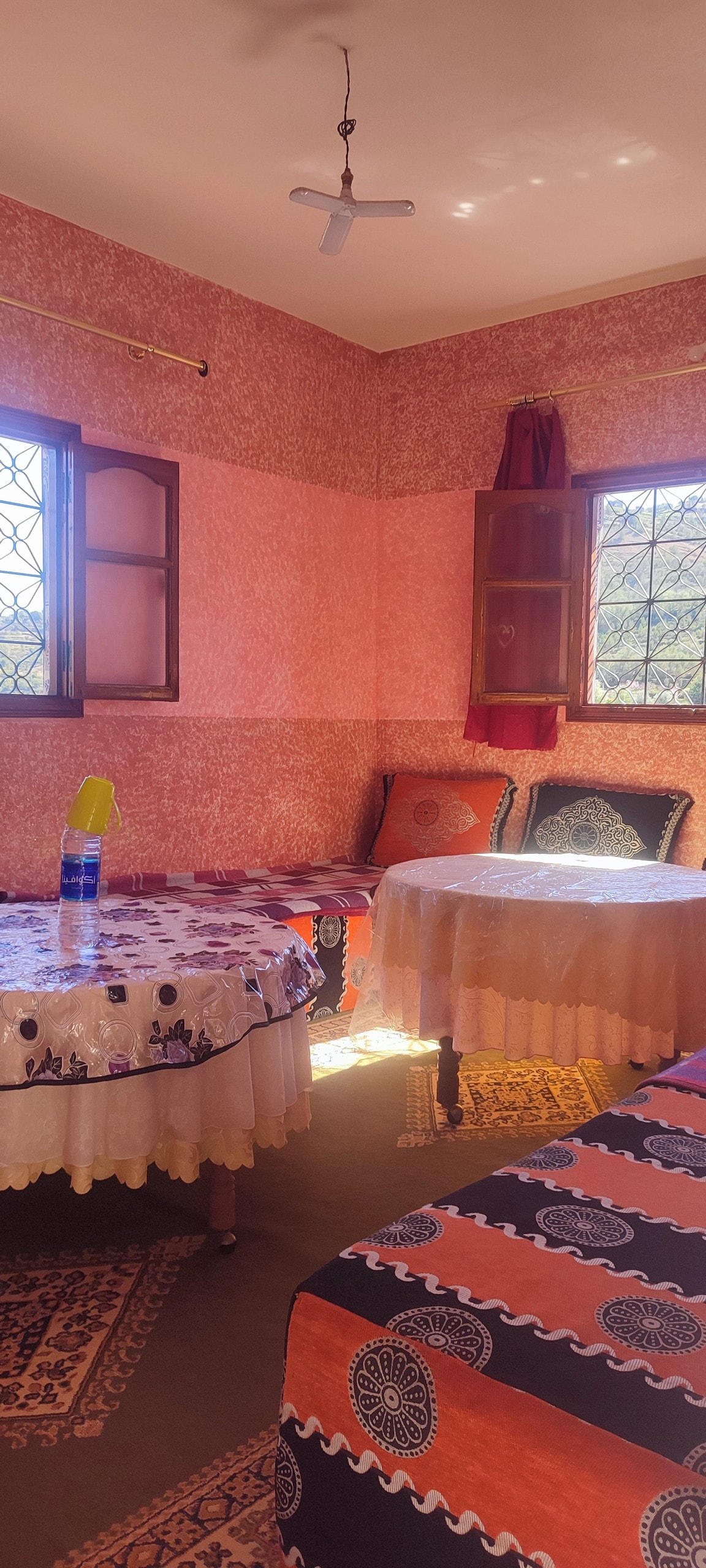 Gite d'étape pour tous les voyageurs ( motos, vélos, randonneurs, ...) avec plusieurs chambres. Une grande salle commune pour partager les repas. Pension complète traditionnelle marocaine. Possibilités de faire des excursions autour de notre gîte dans de magnifiques lieux naturels et préservés : Randonnées dans les gorges d'Attach. Visite du grenier d'Aoujgal Couchée du soleil sur l'Atlas.